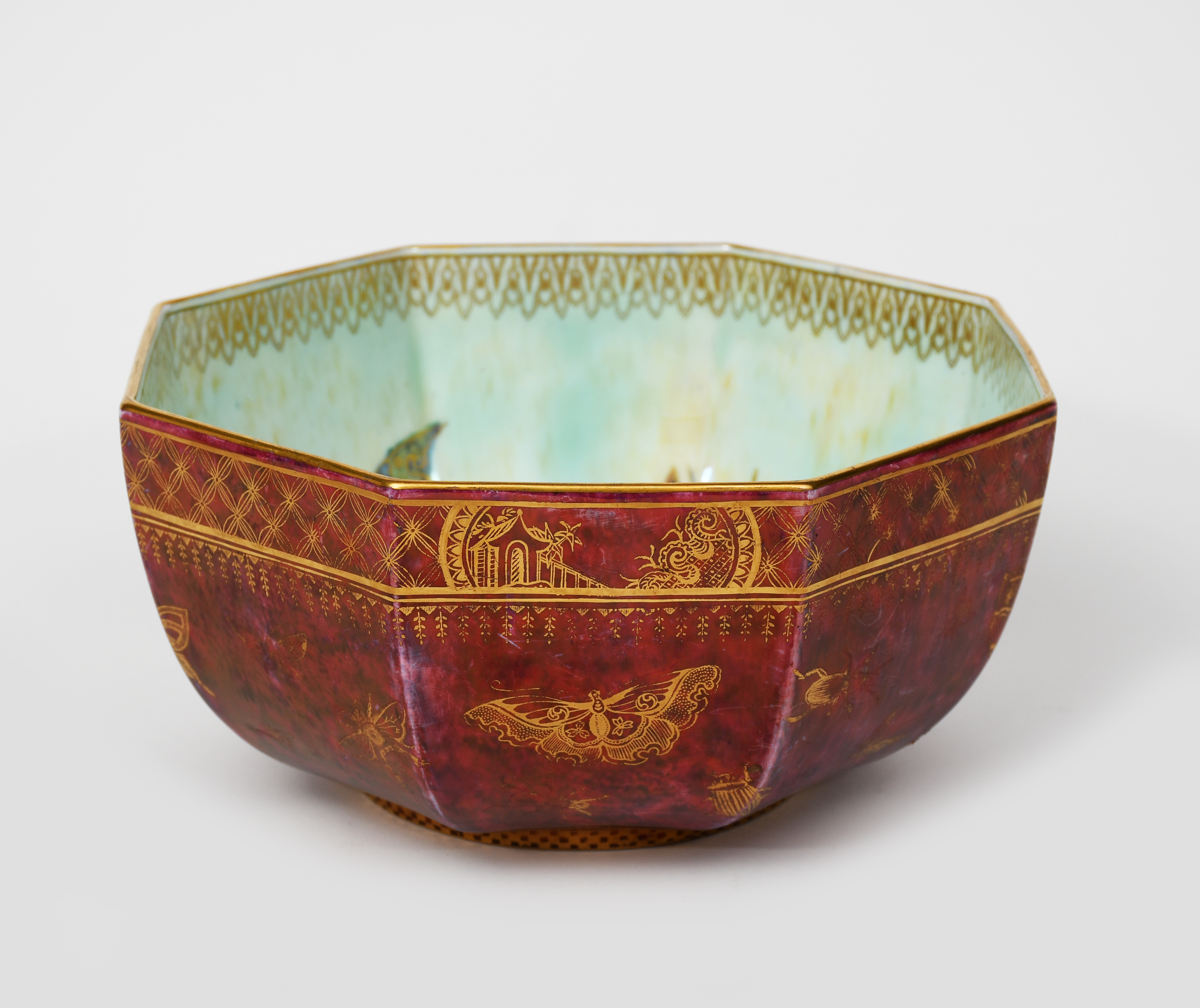 A Wedgwood Pottery Butterfly lustre bowl designed by Daisy Makeig-Jones, octagonal, printed to the exterior with butterflies and bugs in gold on a red lustre ground, the interior pearl lustre printed and painted marks, 22cm. diam.