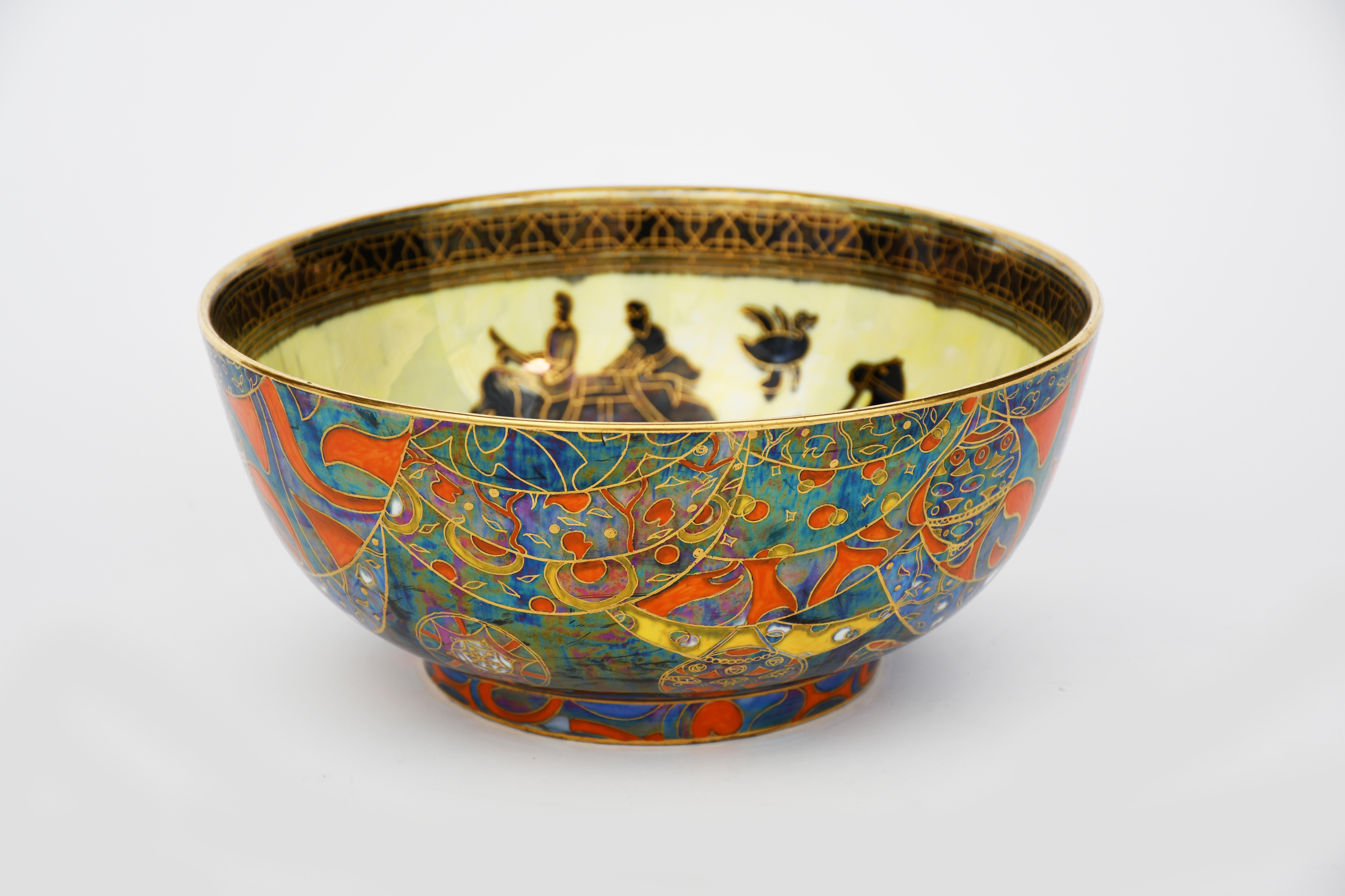 A Wedgwood Pottery Lustre Lahore Imperial bowl designed by Daisy Makeig-Jones, the exterior decorated with swags and paper lanterns, enamelled in colours, highlighted in gilt on a mottled blue lustre ground, the interior a frieze of Indian warriors riding elephants and camels around a central bird motif, on yellow lustre, printed and painted factory marks, 27cm. diam.