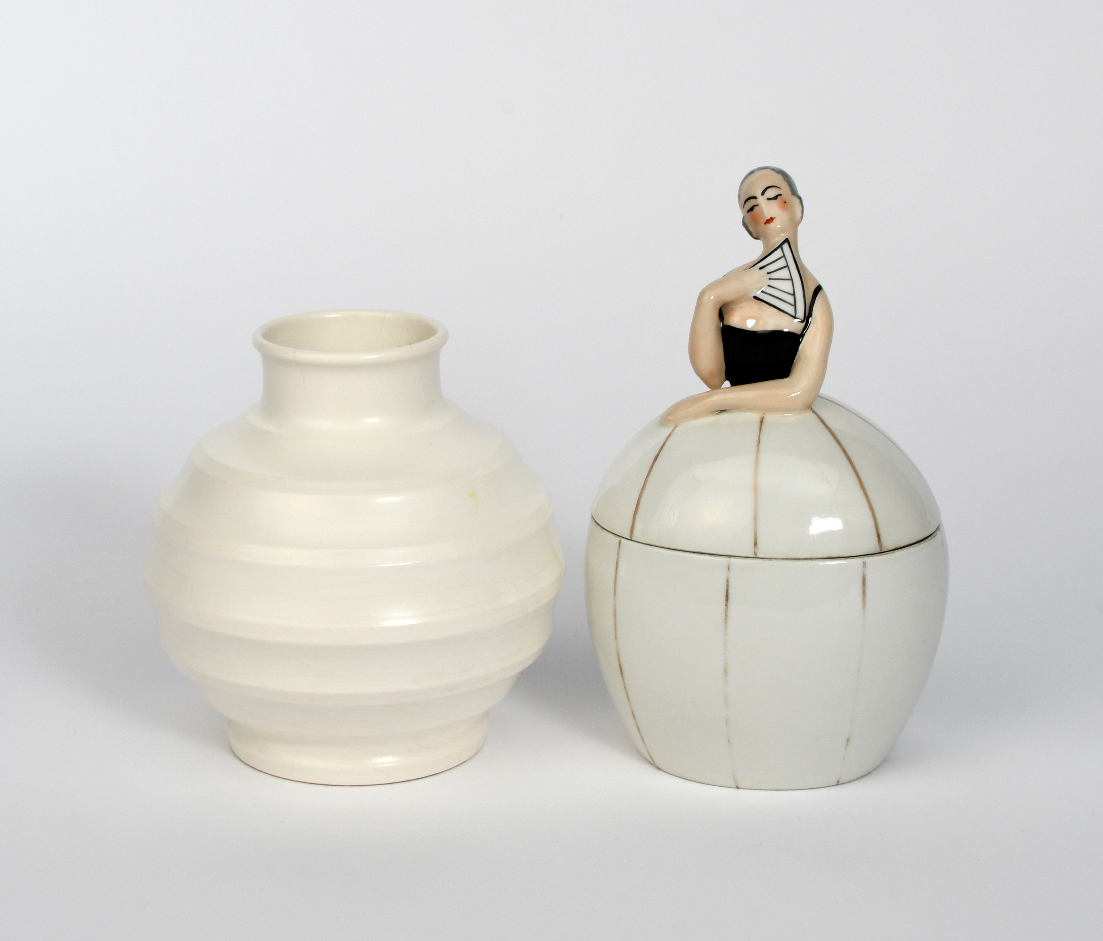 A Wedgwood Pottery vase designed by Keith Murray, ribbed ovoid form, covered in a matt white glaze, and a Robj box and cover, modelled as a lady in a flaring skirt, holding a fan, printed factory marks, hairline and minor chips to vase, 15.5cm. high (3)