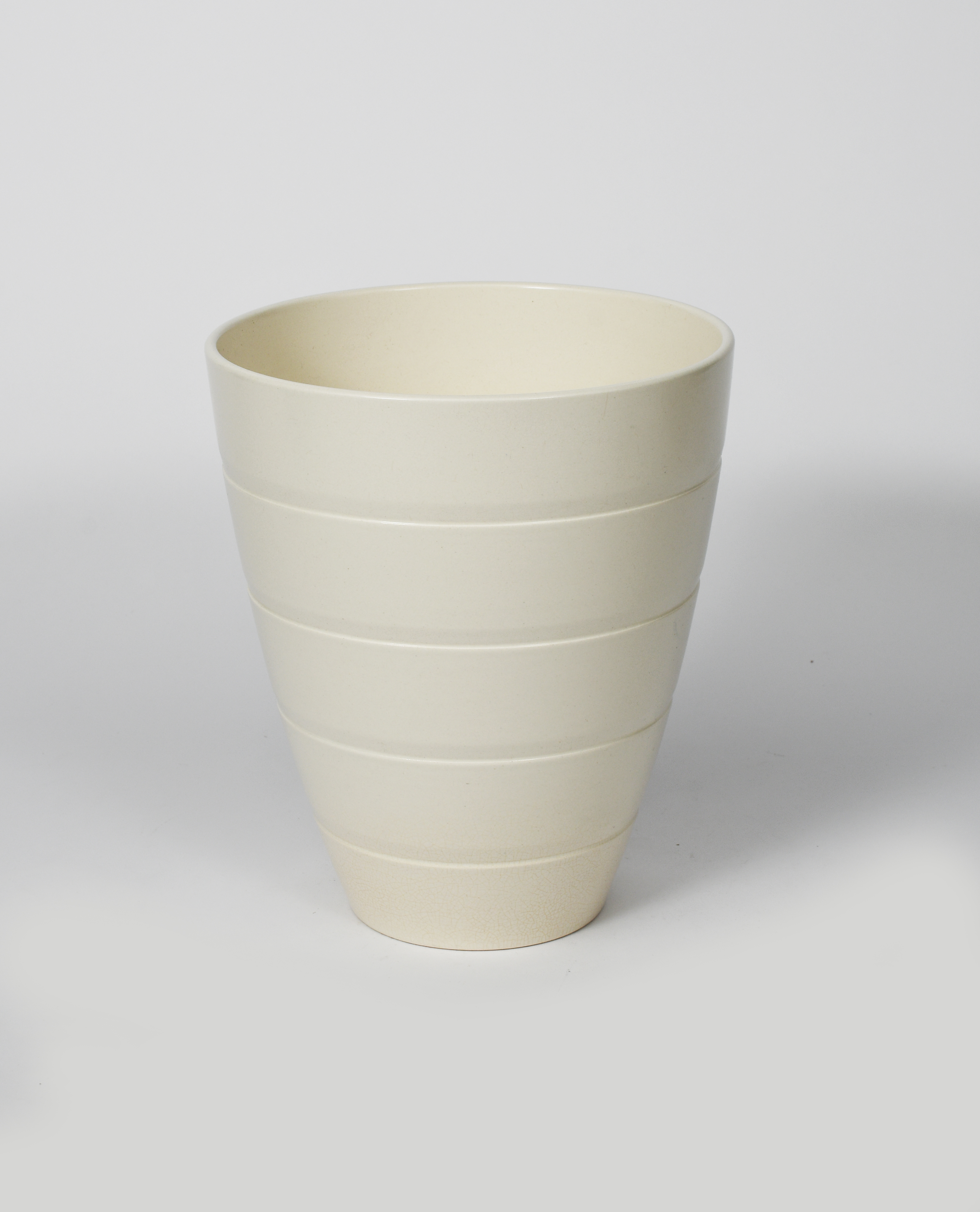 A Wedgwood Pottery vase designed by Keith Murray, flaring conical form with four cut bands, covered in a matt white glaze, printed factory mark and facsimile signature, 23.5cm. high