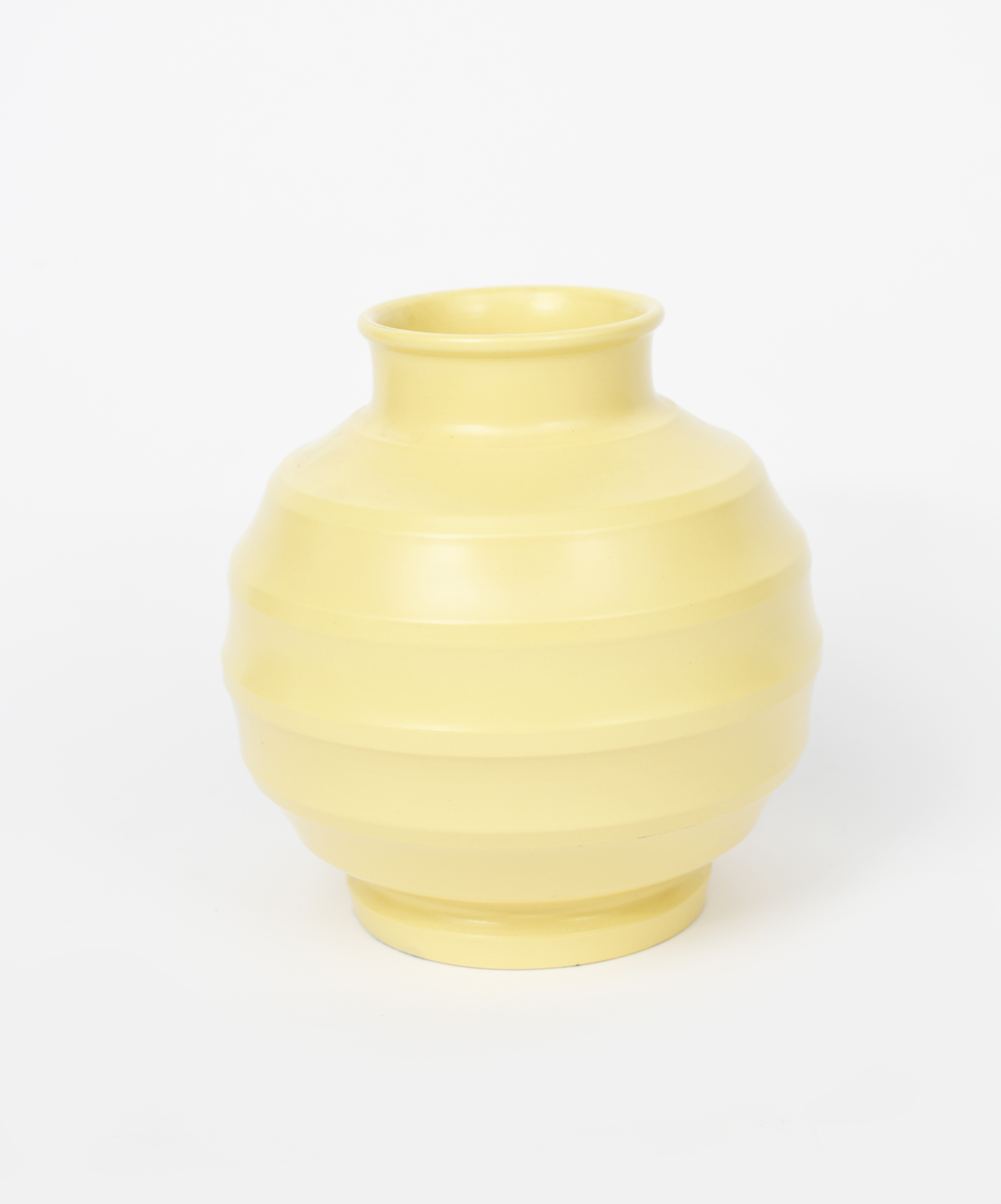 A Wedgwood Pottery vase designed by Keith Murray, shape no. 3765, ovoid ribbed form, covered in a matt yellow glaze printed factory mark, KM monogram, 18.5cm. high