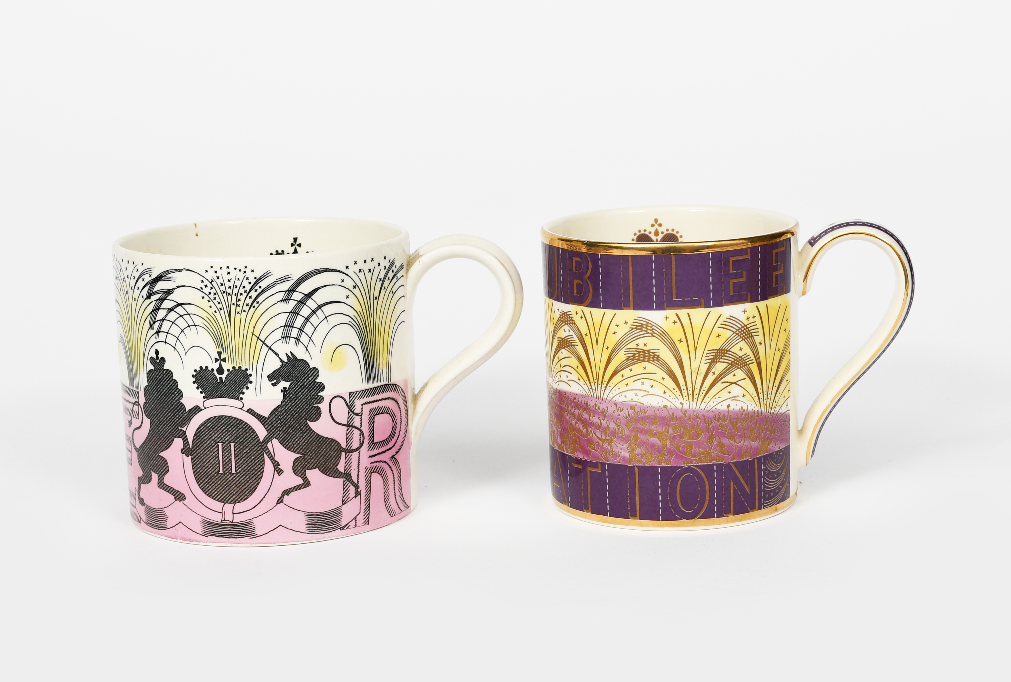 A Wedgwood Pottery Coronation of Her Majesty Queen Elizabeth II 1953 commemorative mug originally designed by Eric Ravilious, printed with royal coat of arms, 1953, below a frieze of fireworks, and a Wedgwood Queen Elizabeth II Golden Jubilee mug printed factory marks, 10.5cm. high (2)