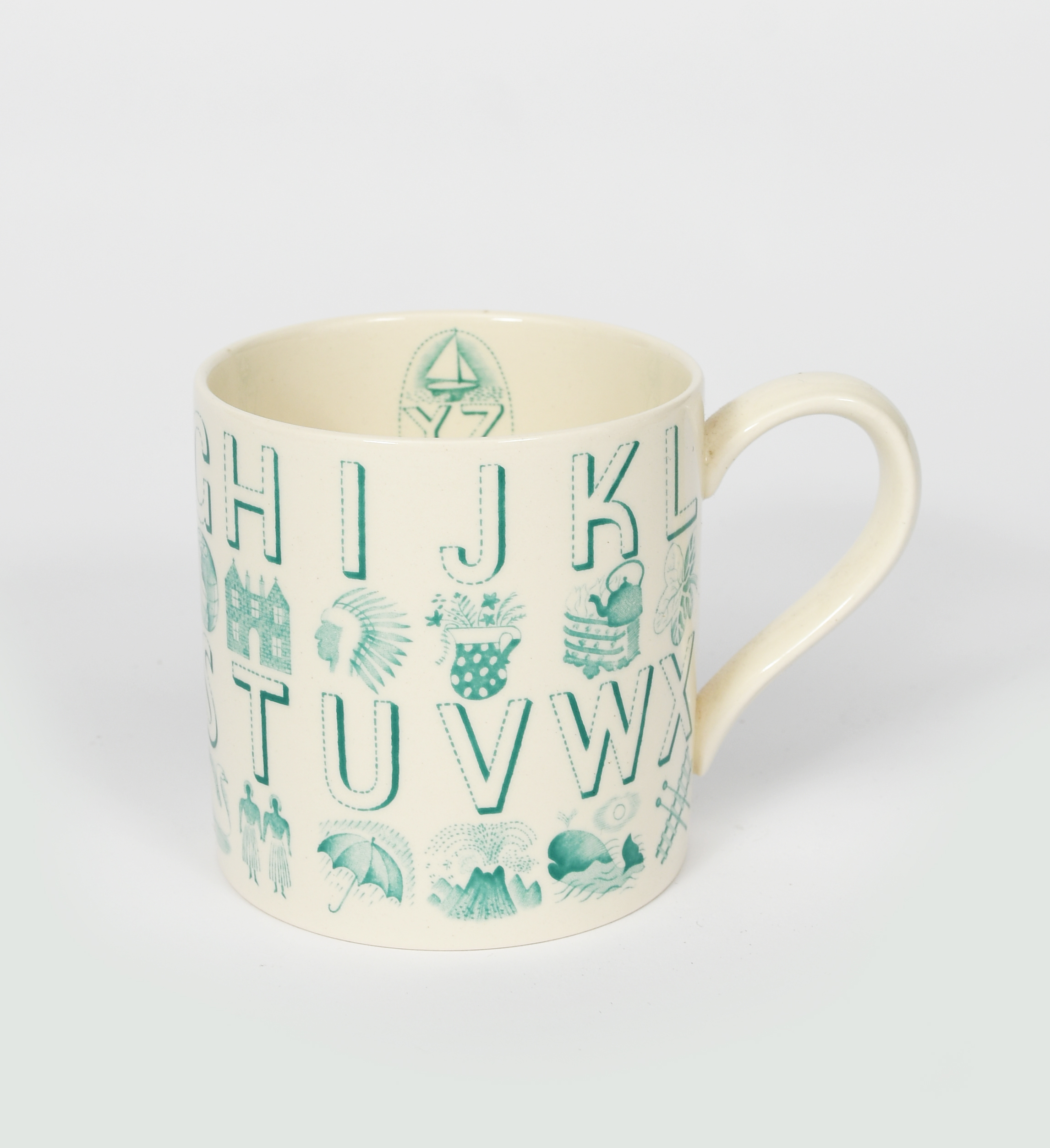 A Wedgwood Pottery Alphabet mug designed by Eric Ravilious, printed in green on a white ground, printed factory mark, 8.5cm. high