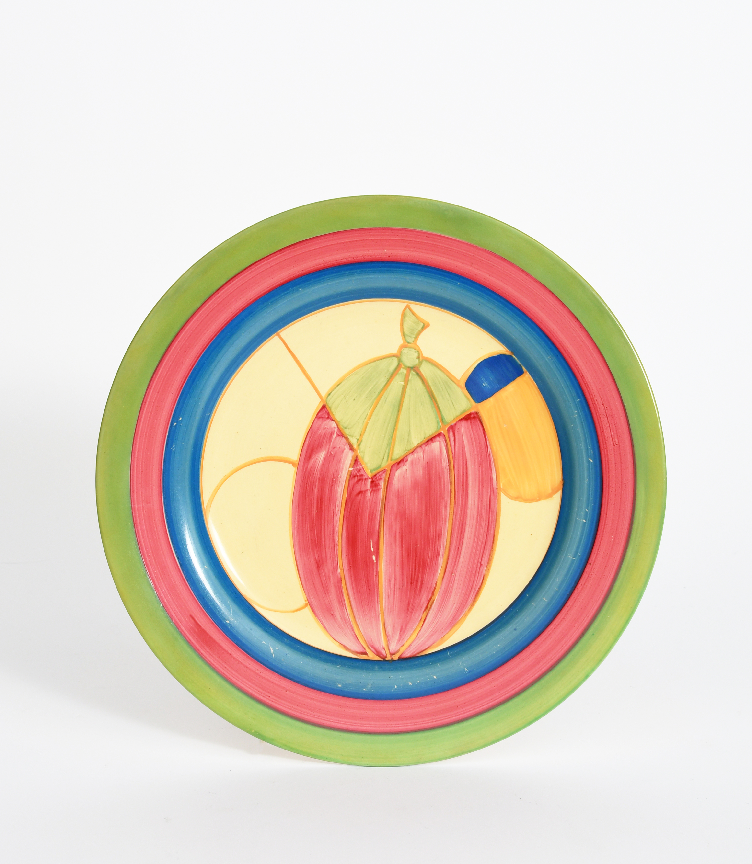 'Cherry' a Clarice Cliff Bizarre bowl, 'Pastel Melon' a Clarice Cliff Fantasque Bizarre plate and 'Kew' a large Clarice Cliff Bizarre platter, painted in colours printed factory mark, 21.5cm. diam. (3)