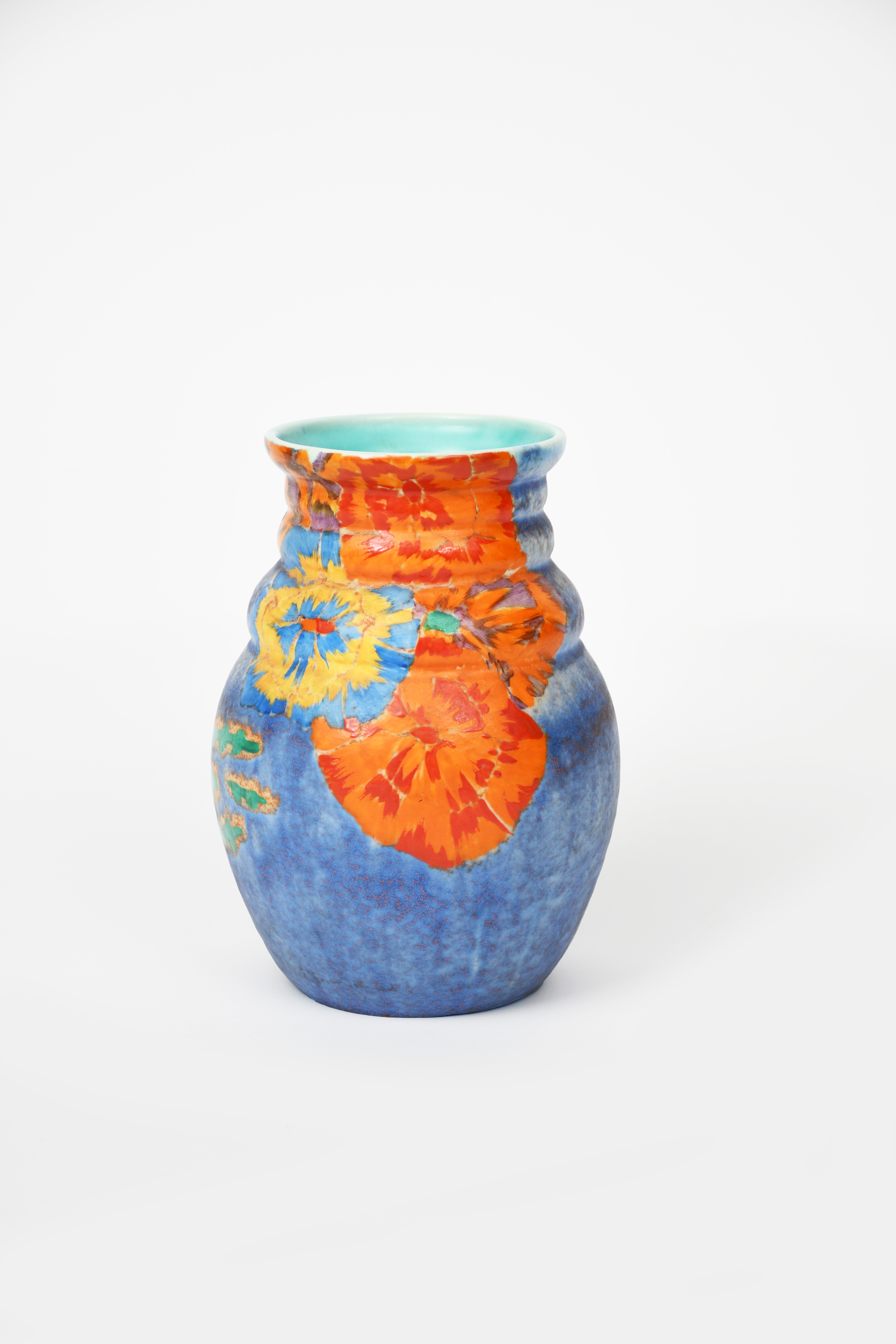 'Inspiration Clouvre' a Clarice Cliff Bizarre 358 vase, enamelled in colours on a matt blue ground, printed and painted marks, 20cm. high