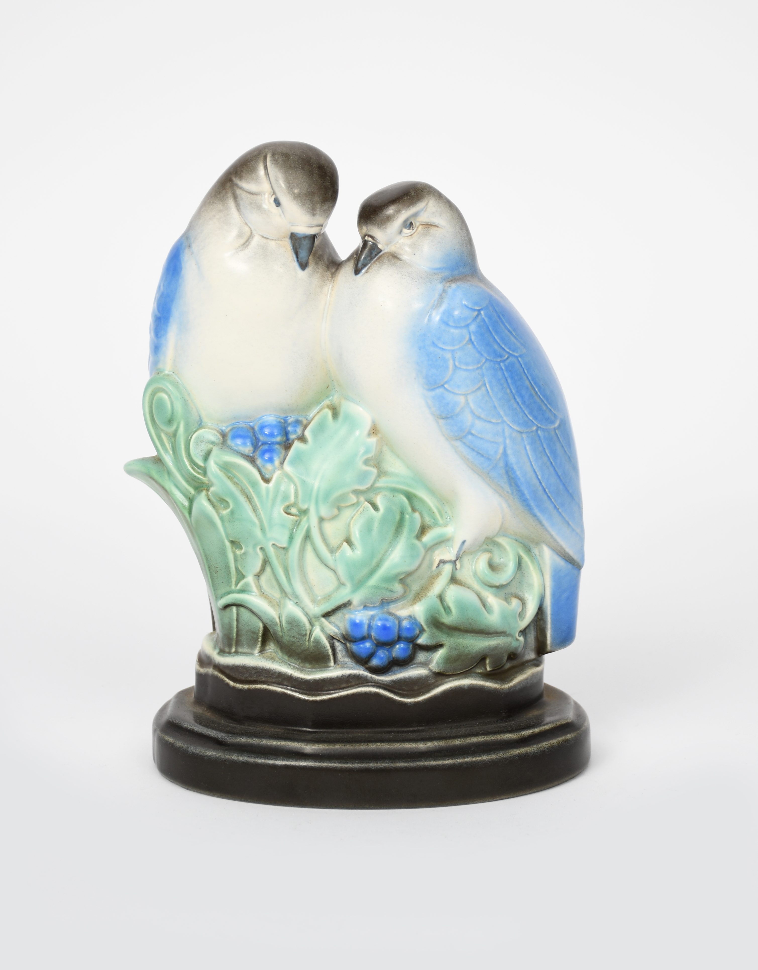 A Poole Pottery Love Birds group modelled by Harry Brown, modelled perched on fruiting vine on oval base, spray glazed in shades of blue, green and chestnut brown Picotee glaze, impressed factory mark, 19.5cm. high