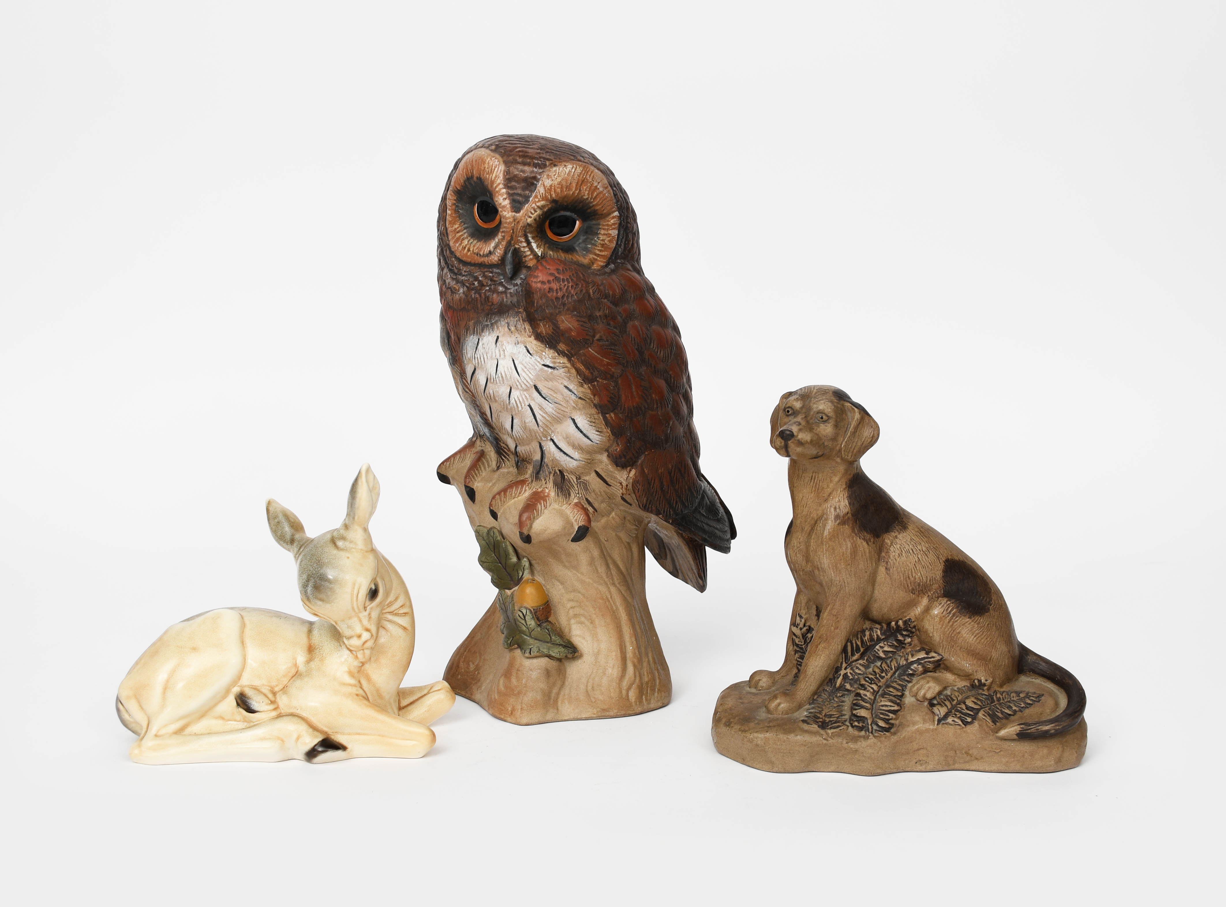 A Poole Pottery stoneware Barred Owl designed by Barbara Linley-Adams, model no. 705, glazed in matt colours, a Poole Pottery seated hound, model no,701 and a Poole Pottery Fawn resting by Marjorie Drawbell, impressed marks, 33cm. high (owl), (3)