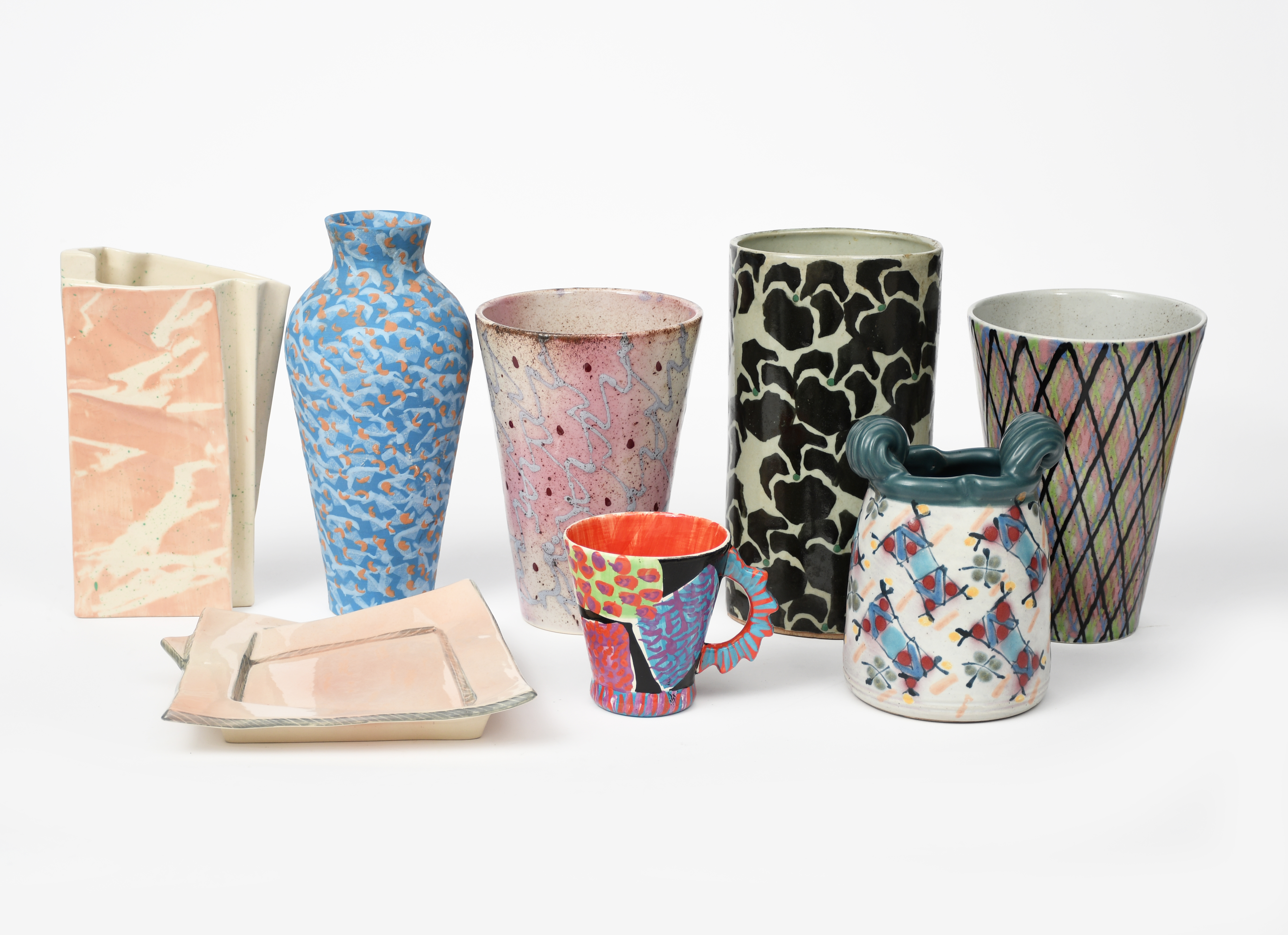 A Next Interior cylindrical vase, elliptical section, painted with black irregular design on celadon, with green spots, another Next Interior shouldered vase, a Next Interior shaped plate by Carol McNicoll, and five other Next Interior ceramics printed factory marks, 26.5cm. high (8)