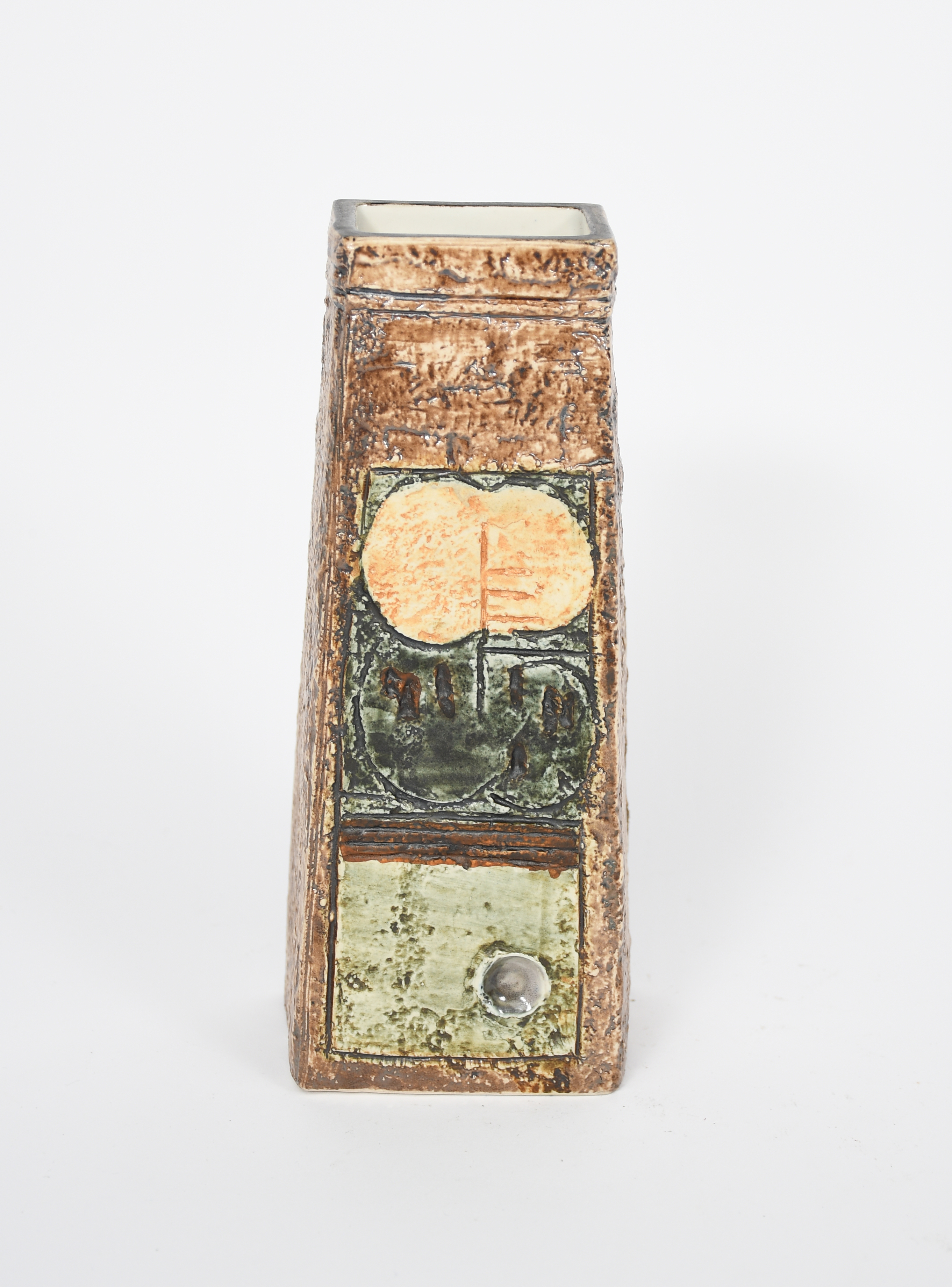 A Troika Pottery Coffin vase by Alison Brigden, tapering rectangular form, cast in low relief with geometric panels, glazed in shades of green and brown, painted factory mark, artist monogram, 17cm. high