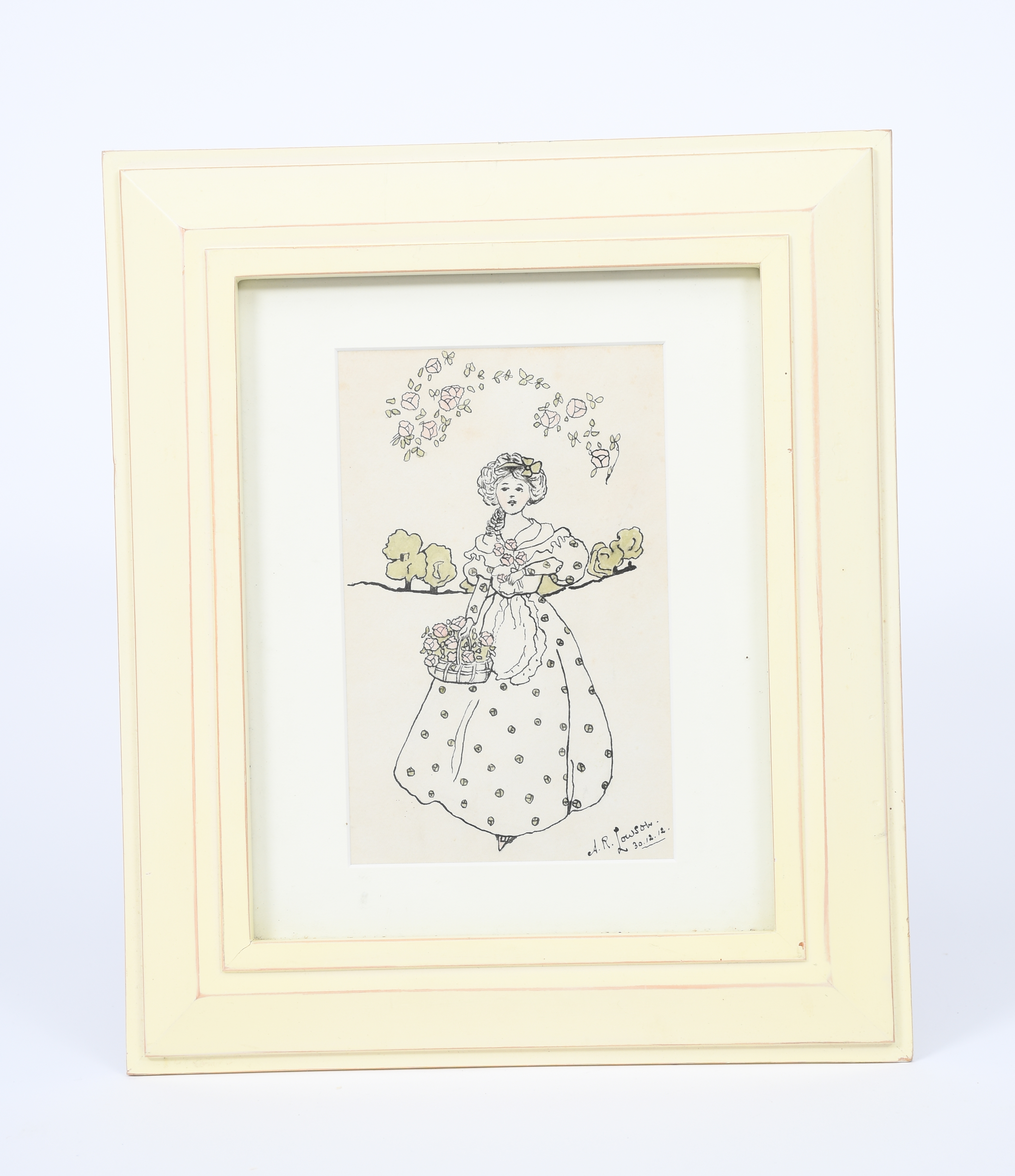 pen and ink on paper of a young lady walking before a row of trees, throwing Glasgow roses from her basket, , framed