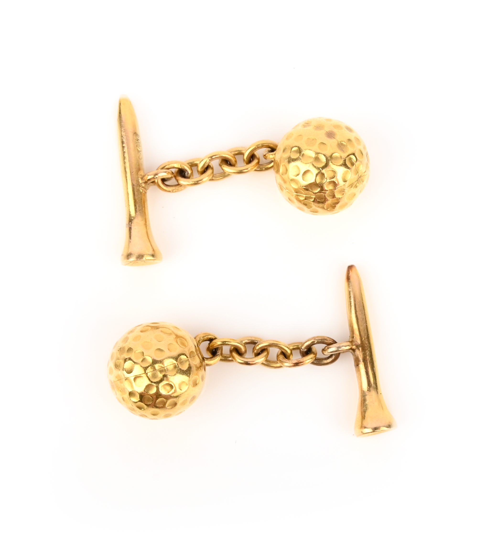 A pair of gold golf ball cufflinks, each link with a gold ball and tee joined by plain gold chain in yellow gold, tee 2.1cm high, 10.7g total