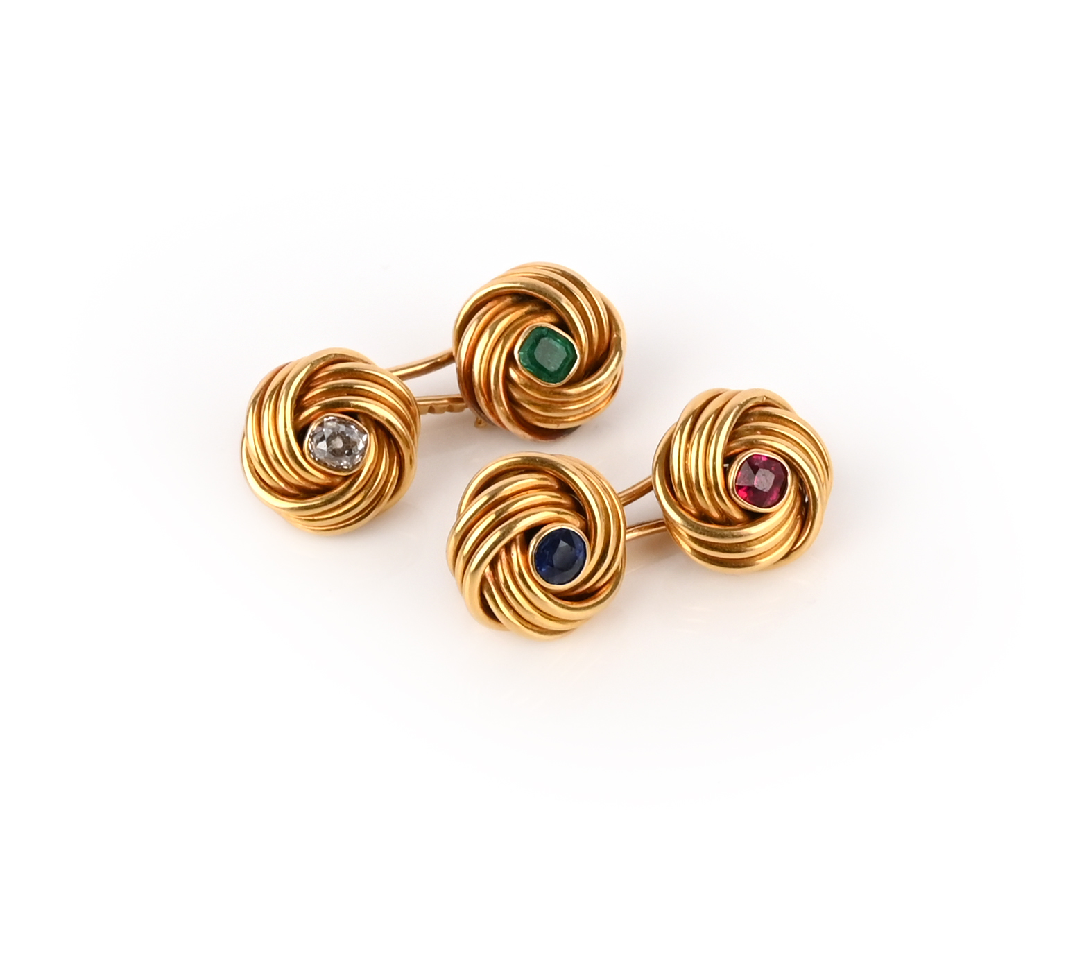 A pair of gold and gem-set cufflinks, mid 20th century, each end designed as a knot of gold wire, set with a circular-cut sapphire, and a cushion-shaped ruby, emerald and diamond respectively, each end 1.2cm diameter