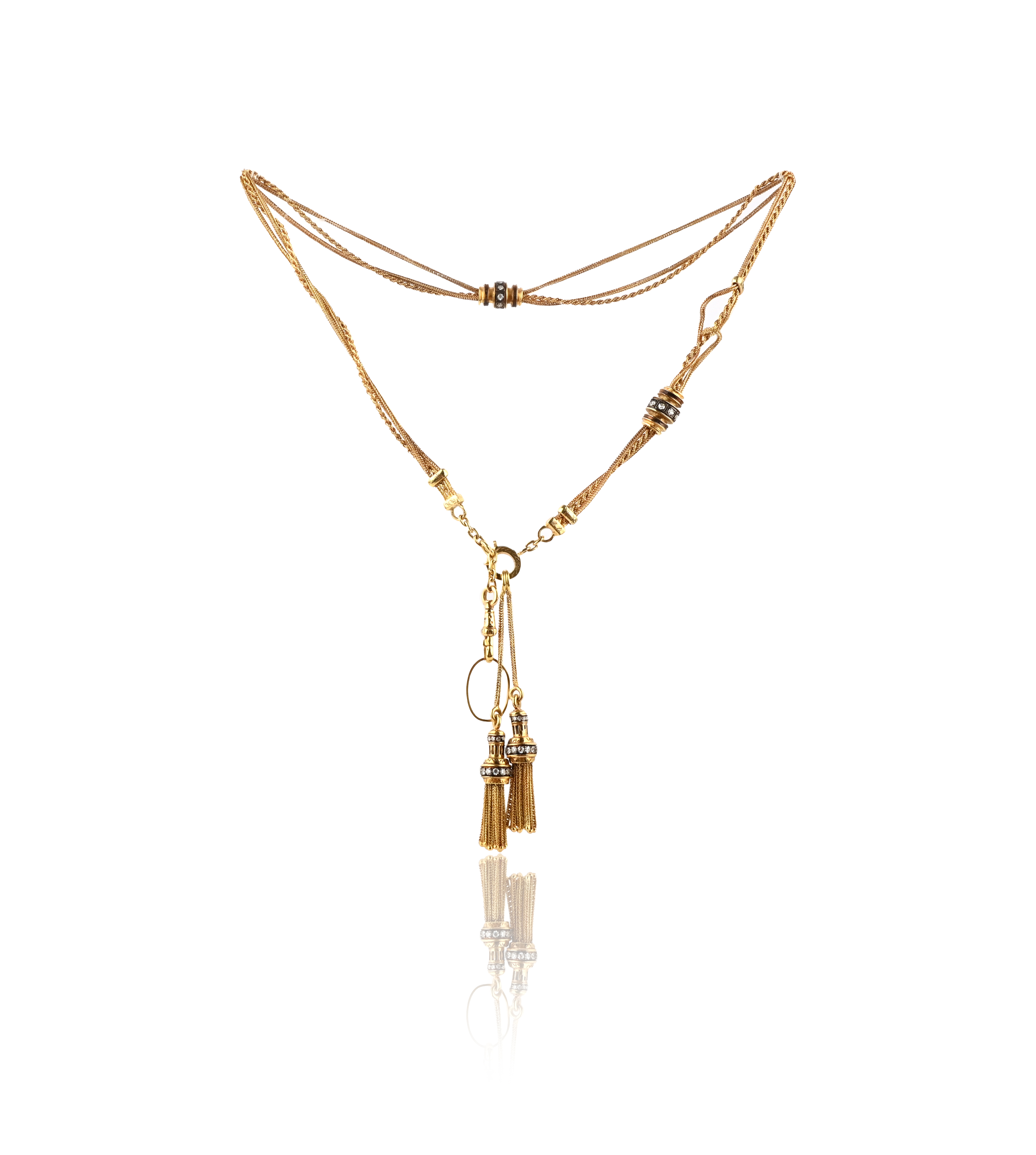 A gold and diamond necklace; the three strand chain of rope twist and fox tail linking, threaded with fluted gold motifs set with brilliant-cut diamonds, the clasp suspending two similar gold and diamond tassel pendants from an annular clasp, length 45cm