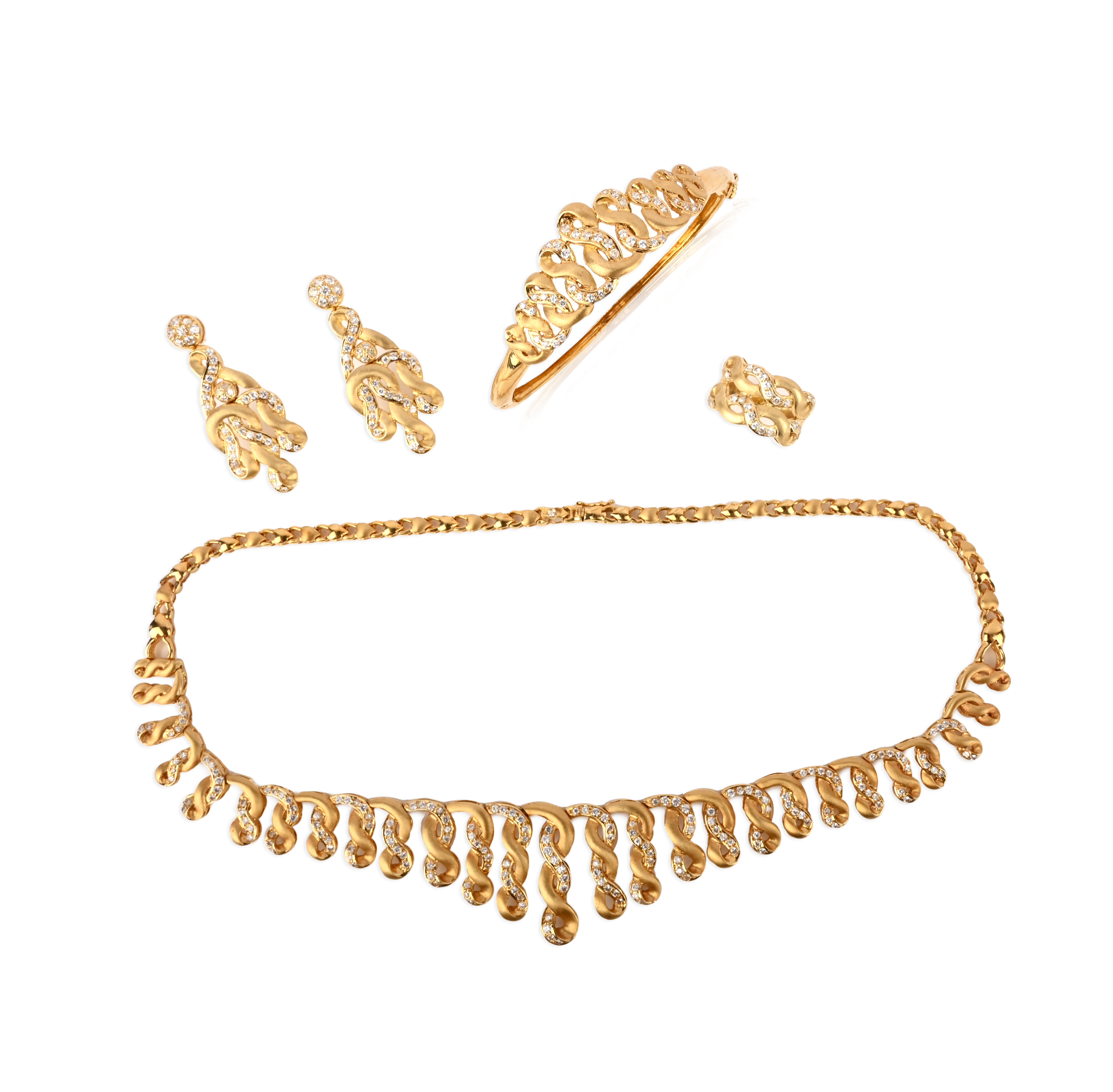 A gold and cubic zirconia parure, comprising: a necklace, a hinged bangle, a pair of earrings and a ring, each in yellow gold, of twisted design, set with brilliant-cut cubic zirconia, necklace length 43.5cm, bracelet inner circumference 17.2cm, earring length 4.5cm each, post fittings, ring size M, total weight 97 grams, one stone deficient, case