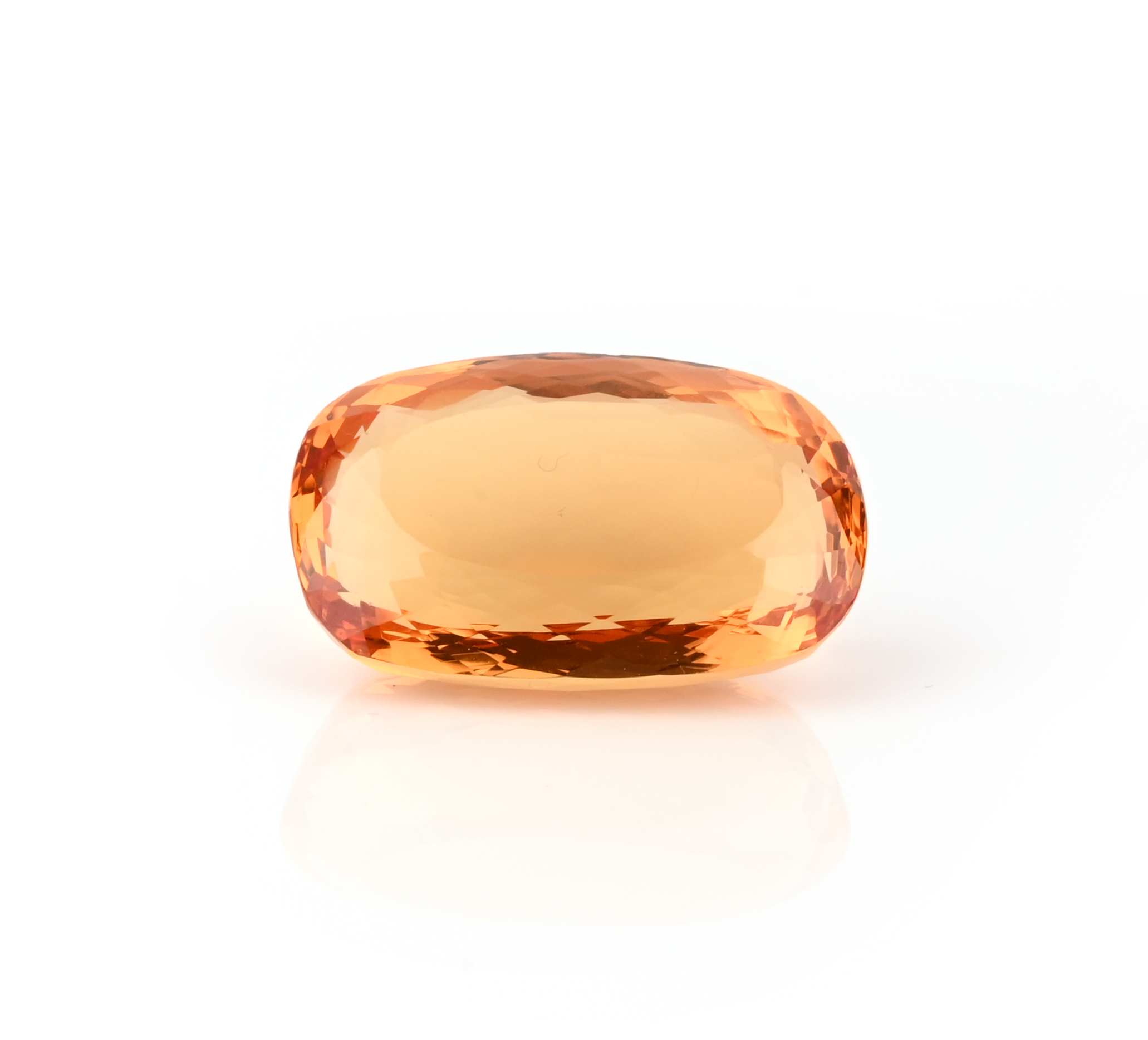 An unmounted topaz, the elongated cushion-shaped topaz of orange hue weighing 62.49 carats