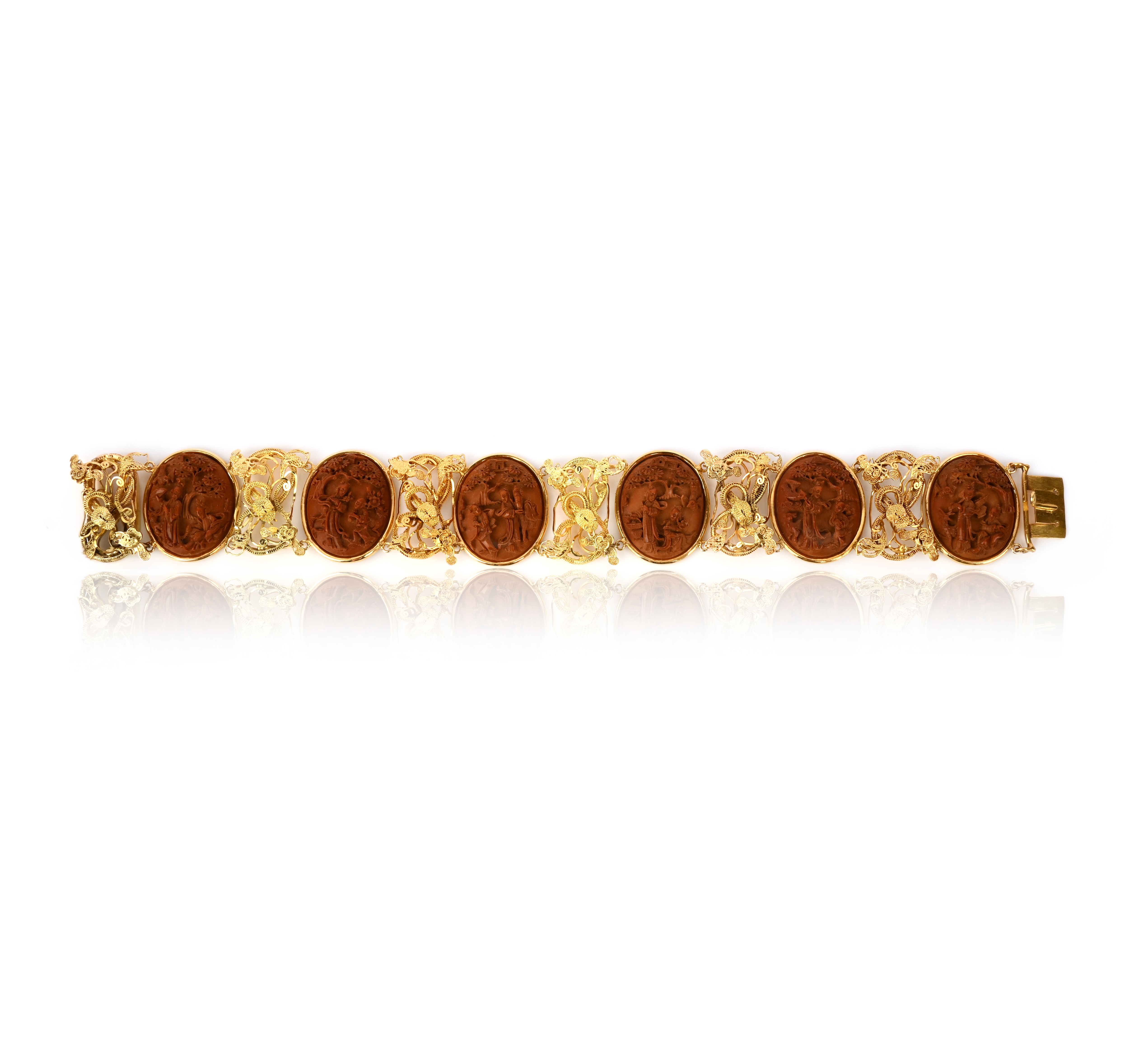 A late 19th Century carved peach nut and gold bracelet, set with six carved peach nut scenes within gold filigree links, 19cm long