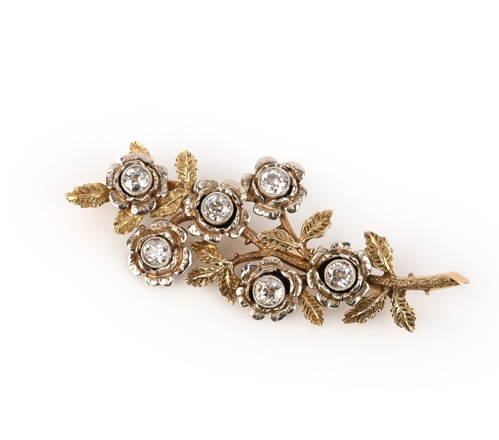 A diamond brooch, early 20th century, designed as a spray of wild roses in three-coloured gold, set with circular-cut diamonds, length 5.2cm, unidentified assay marks, maker's mark KK