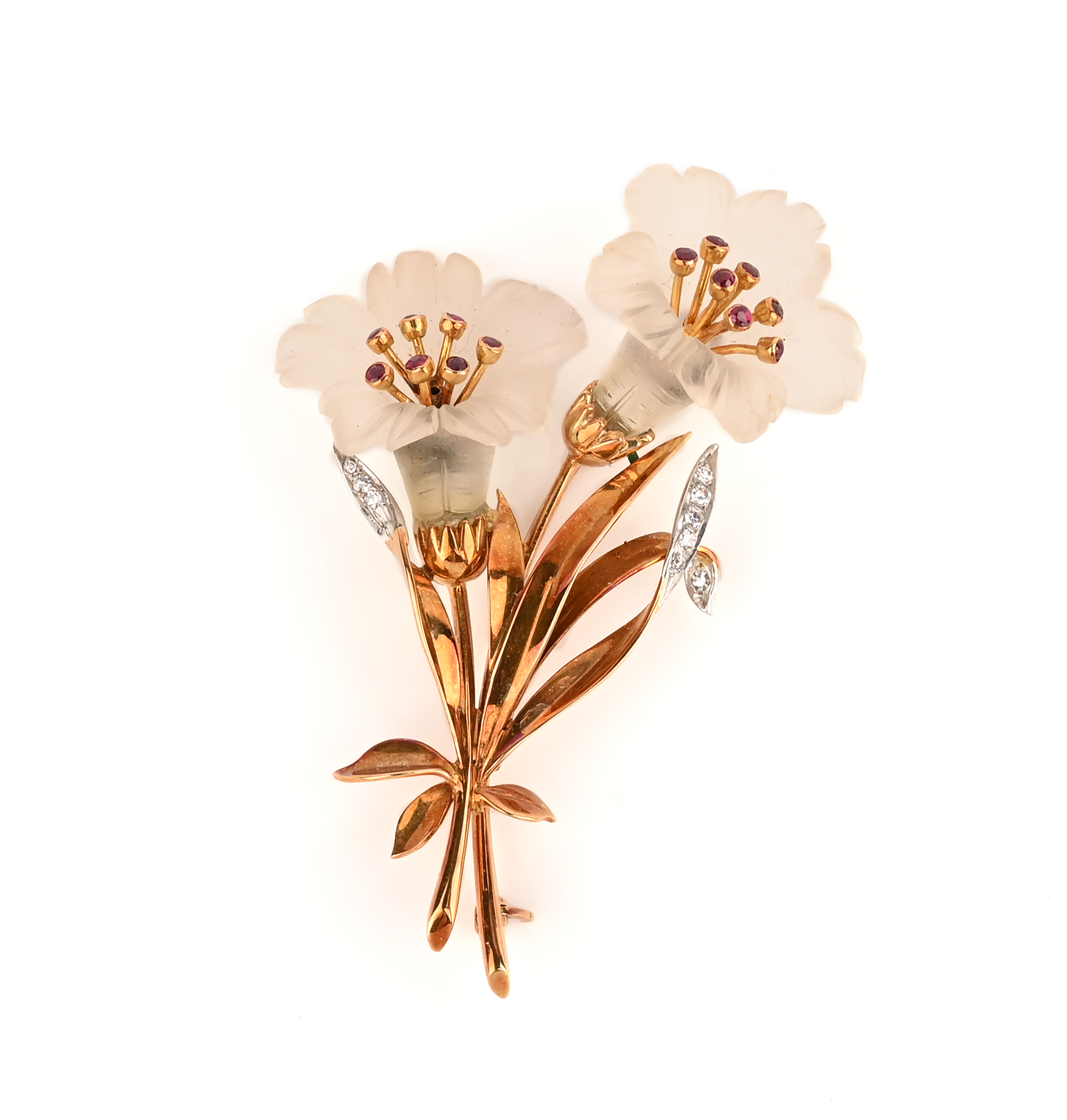 Cropp & Farr, rock crystal and ruby flower brooch, circa 1954, the carved rock crystal flowers with ruby stamens, set in 14ct yellow gold with diamond-set leaves, maker C&F and London hallmarks for 14ct gold, date letter T for 1954, 6.7cm high, fitted case stamped Garrard & Co.