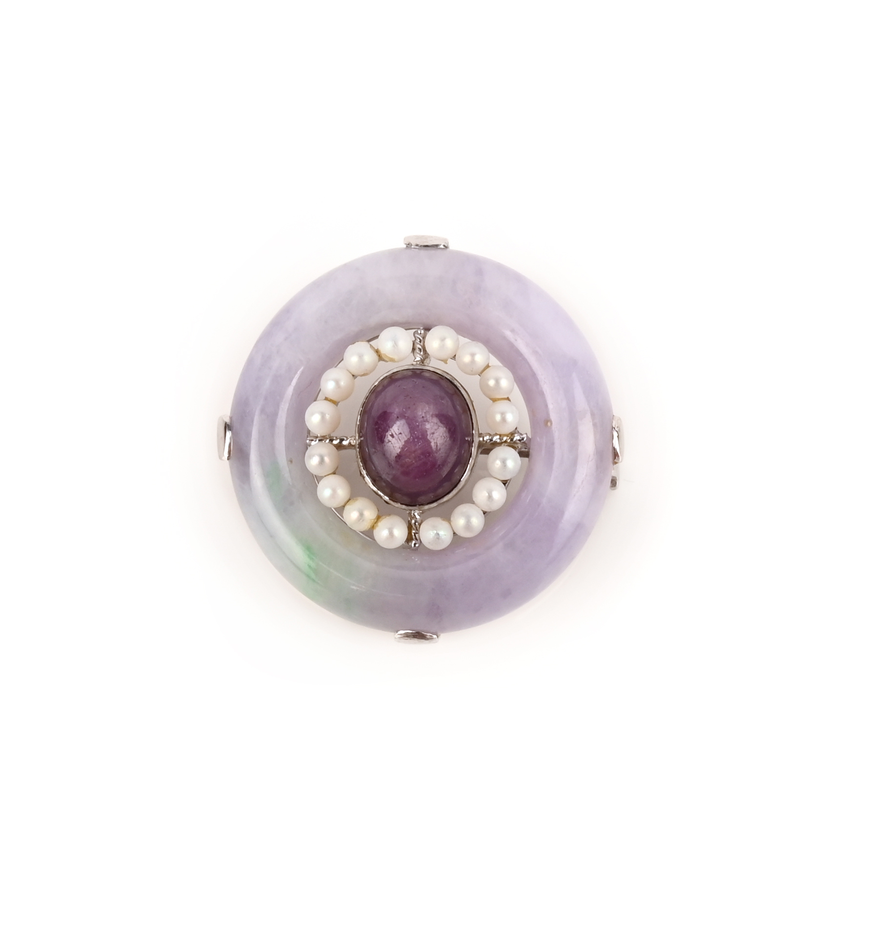 A lavender jadeite, star ruby and cultured pearl brooch, the cabochon star ruby within a border of seed pearls, to an outer ring of carved lavender jadeite, mounted in white gold, diameter 3.5cm, stamped 18K