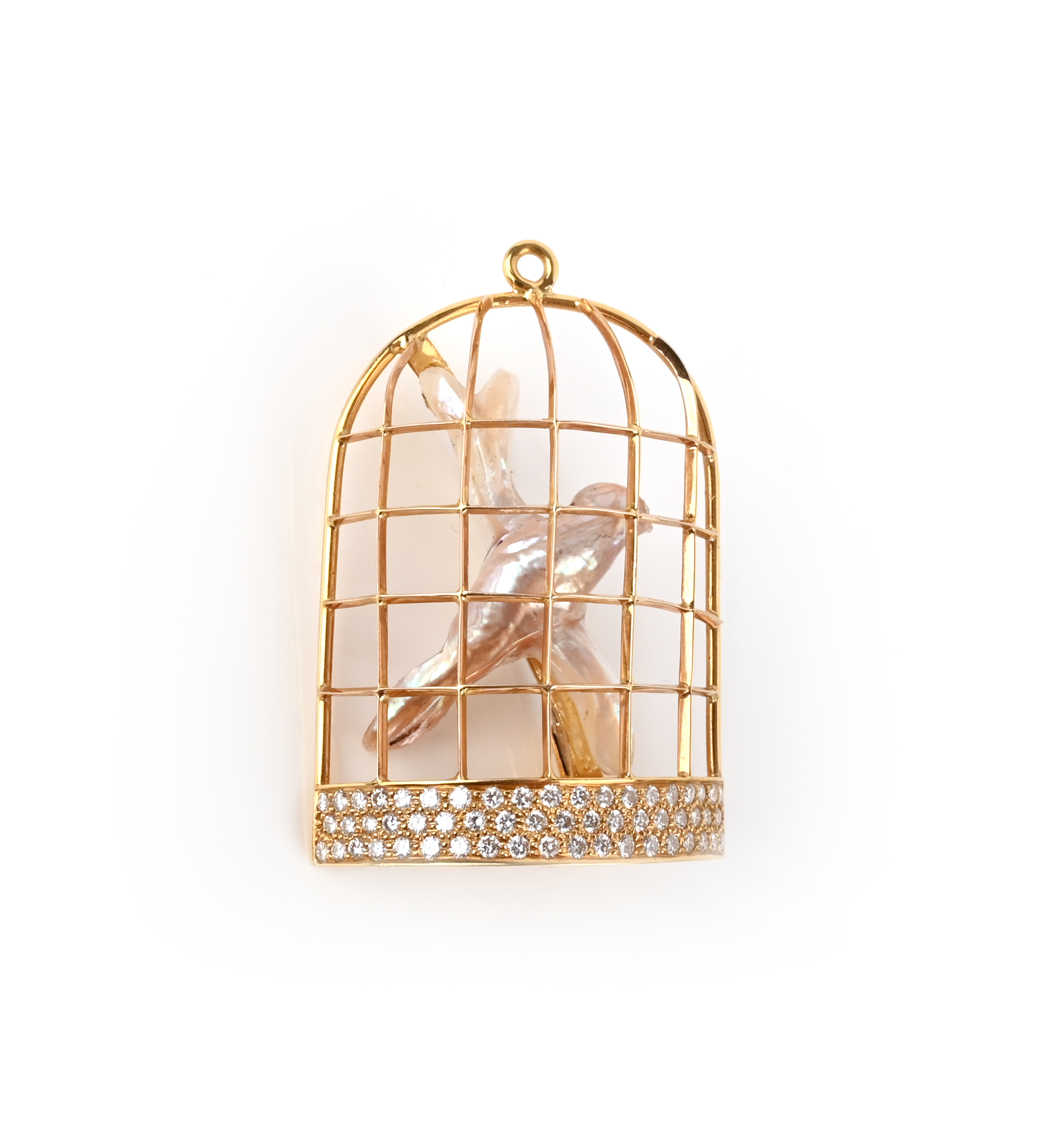 Geoff Rowlandson, a cultured pearl and diamond brooch, 'Only a Bird', set with a baroque cultured pearl in the shape of a bird on a branch, within a gold bird cage pavé-set with brilliant-cut diamonds, height 4.7cm, inscribed 'Only a Bird', signed Geoff Rowlandson, British hallmarks for 18ct gold, fitted case