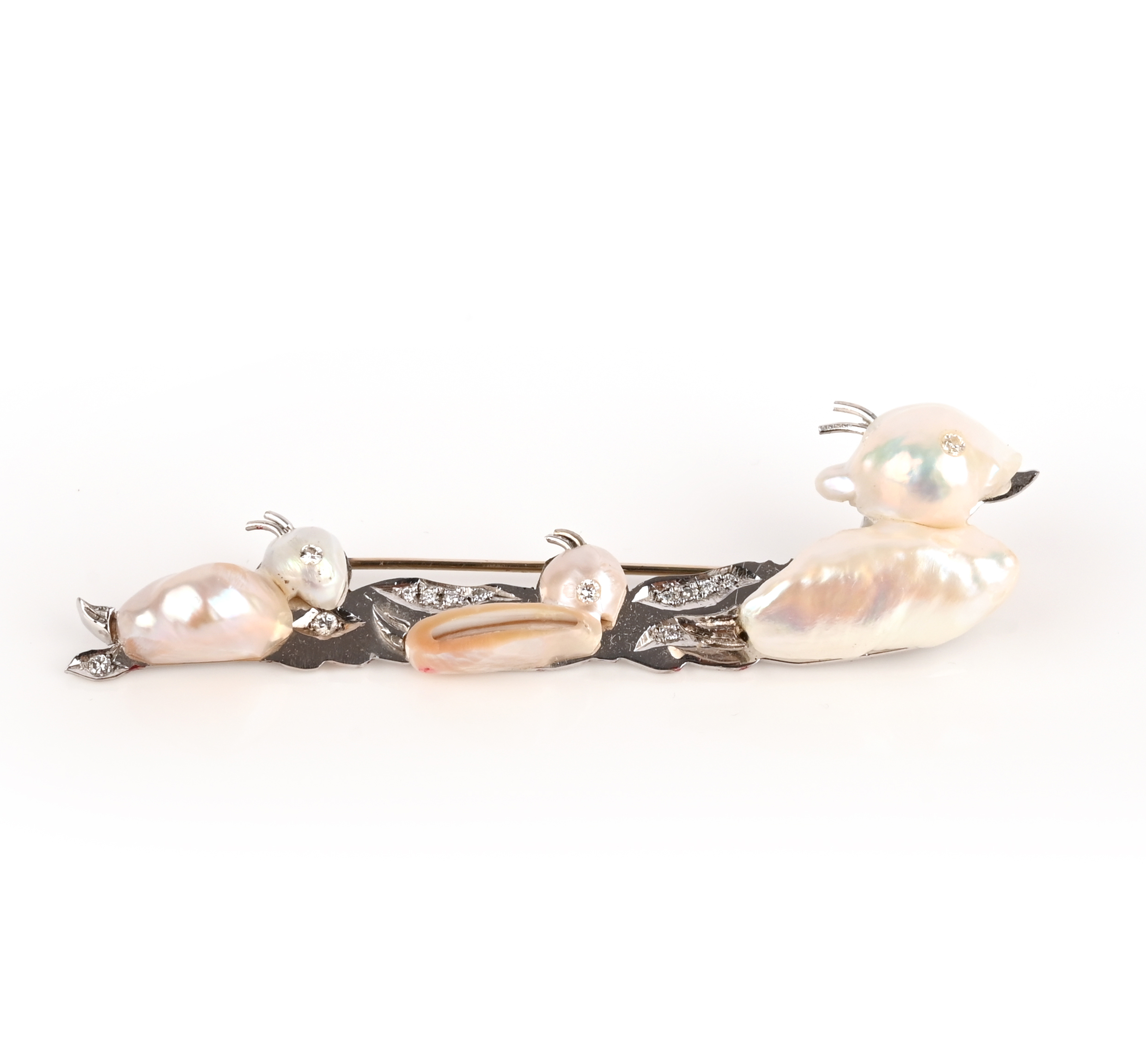 Geoff Rowlandson, a cultured pearl and diamond brooch, 'Keep Up, You Guys', set with three graduated baroque cultured pearls in the form of a mother duck with two ducklings following behind, their eyes inset with brilliant-cut diamonds, the water's surface in white gold accented with brilliant-cut diamonds, length 8cm, inscribed 'Keep up you guys', signed Geoff Rowlandson, British hallmarks for 18ct gold, fitted case, one diamond deficient