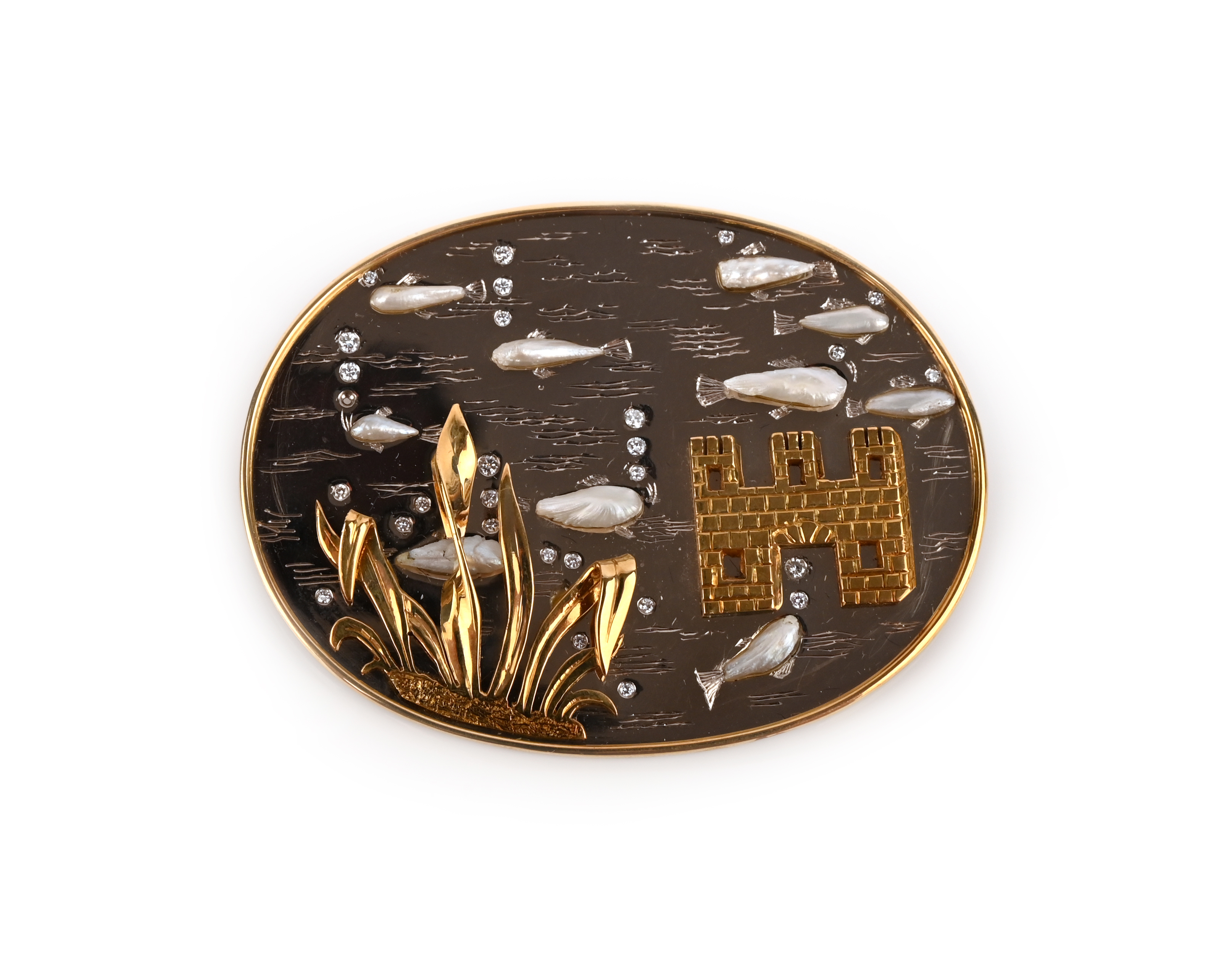 Geoff Rowlandson, gold, cultured pearl and diamond brooch, 'In the Swim', of oval outline, designed as a shoal of fish swimming among reeds and an underwater castle, the polished white gold ground engraved with waves and set with brilliant-cut diamonds symbolising bubbles, length 5.5cm, the reverse inscribed 'In the Swim', signed Geoff Rowlandson, fitted case