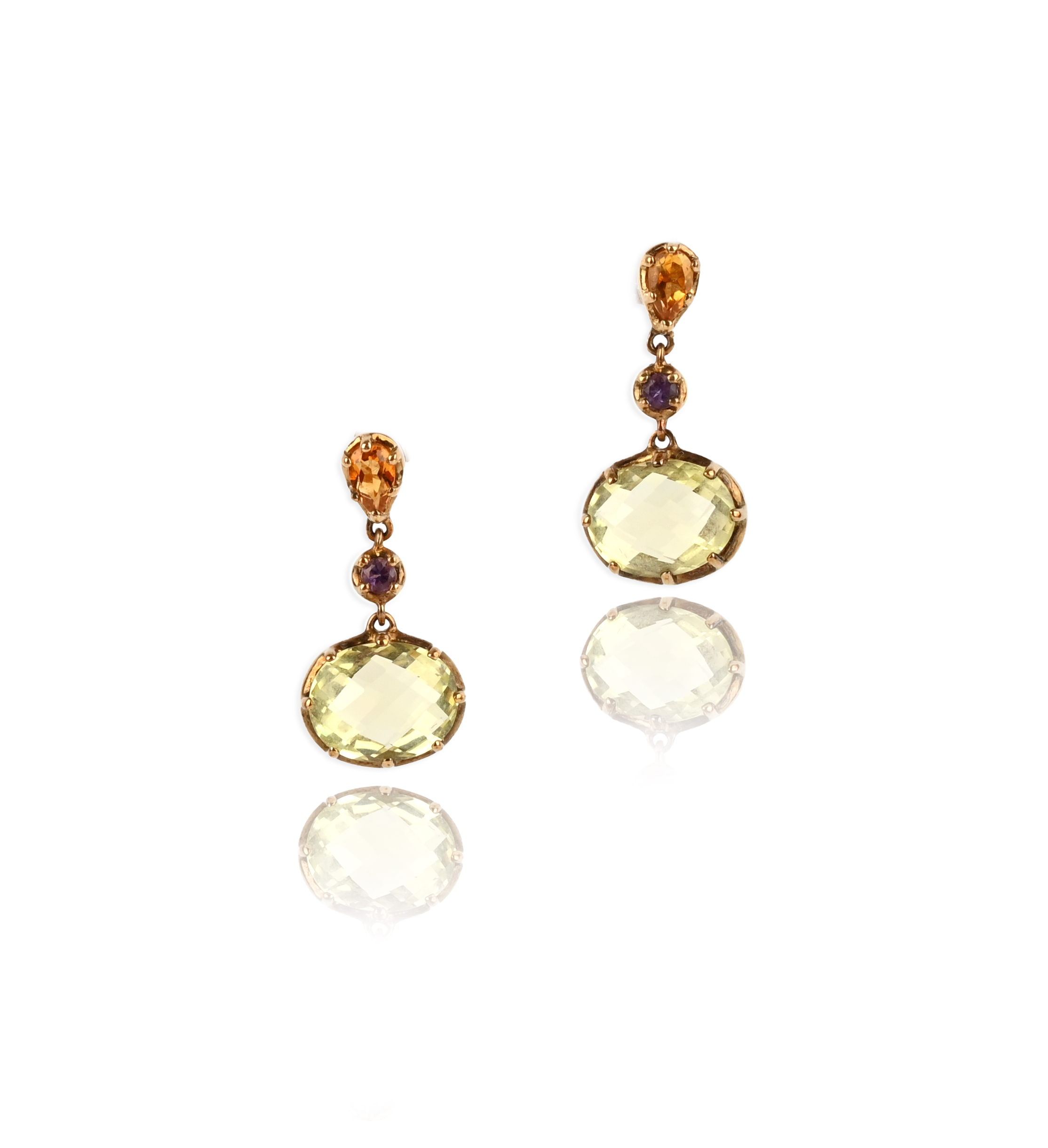 A pair of gem-set gold drop earrings, set with a citrine, amethyst and fancy-cut prasiolite in gold collets, 2.3cm high