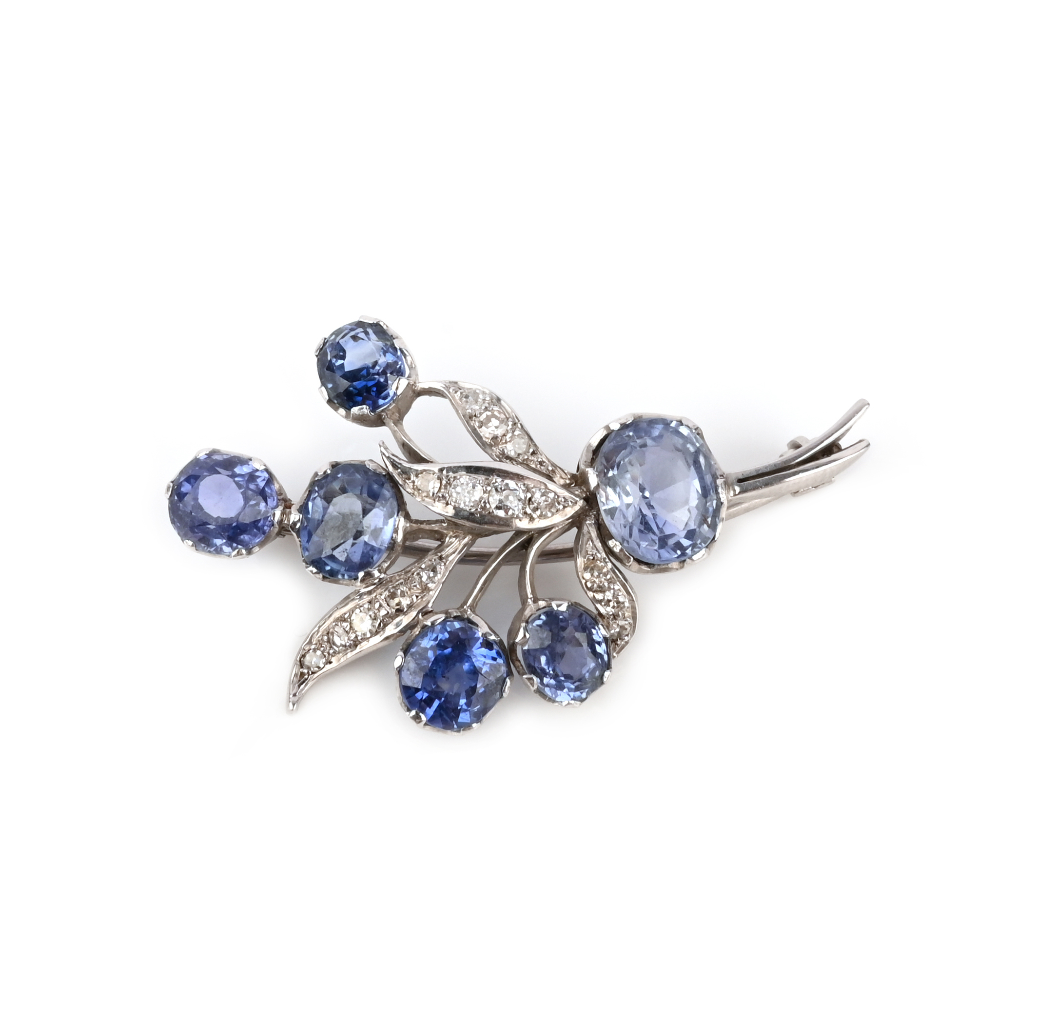 A sapphire and diamond brooch, mid 20th century, designed as a spray of flowers, set with oval sapphires and circular- and single-cut diamonds, mounted in white gold, length 4.6cm