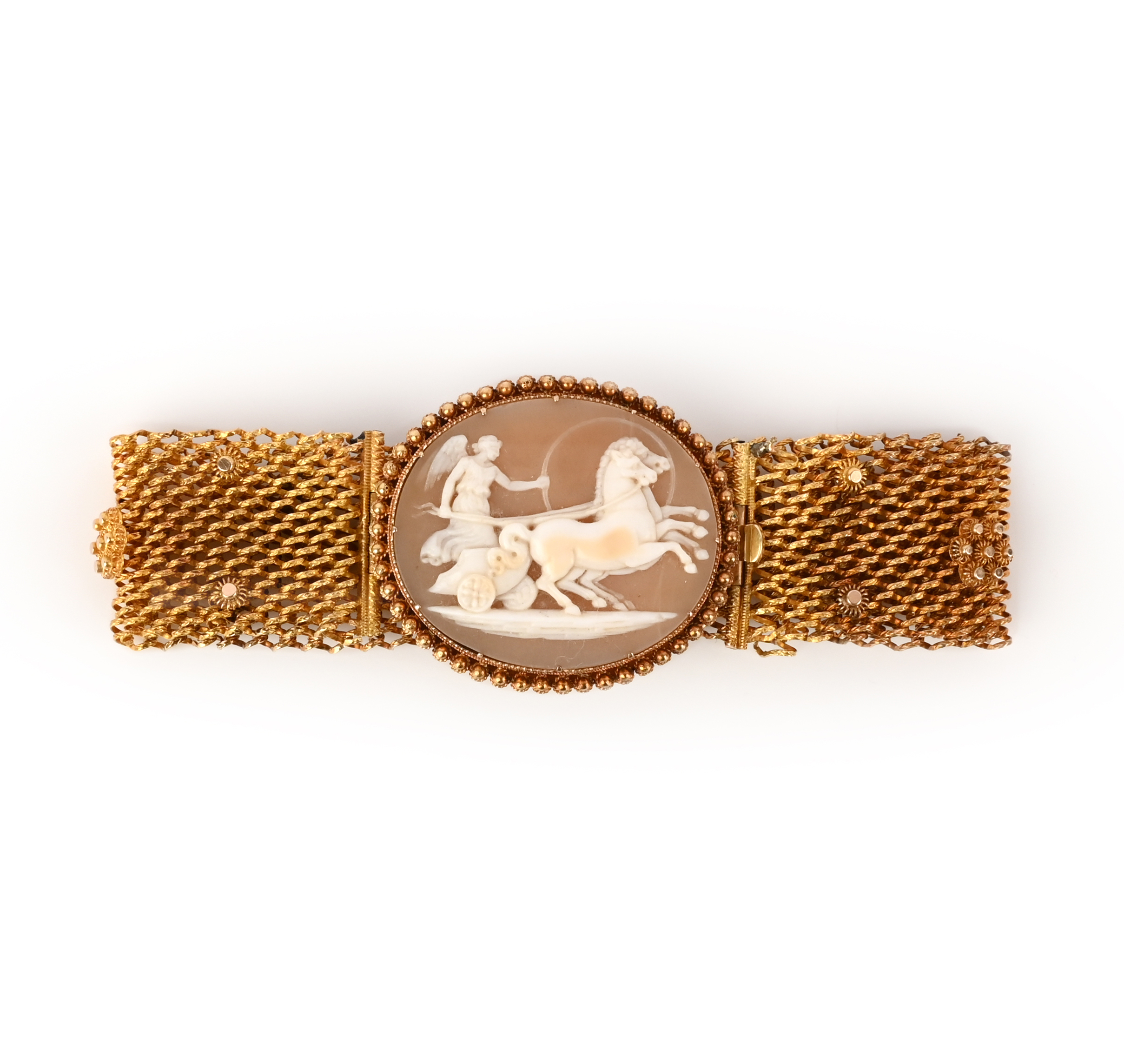 A gold and shell cameo bracelet, mid 19th century, the clasp set with a conch shell cameo carved with the chariot of Victory, within a gold cannetille border, to a gold mesh link bracelet decorated with gold cannetille studs, length 16.3cm, cameo 2.8 x 2.4cm