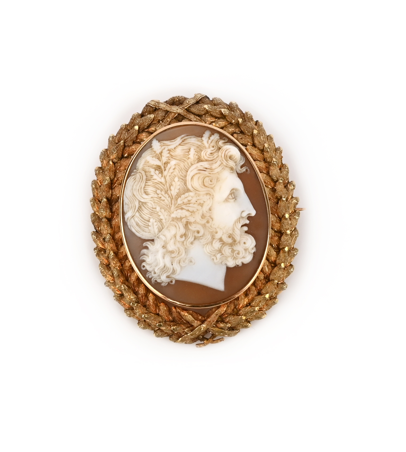 A shell cameo brooch, 19th century, the shell cameo carved to depict Zeus, within an engraved gold border designed as a laurel wreath, overall dimensions 4.9 x 3.9cm