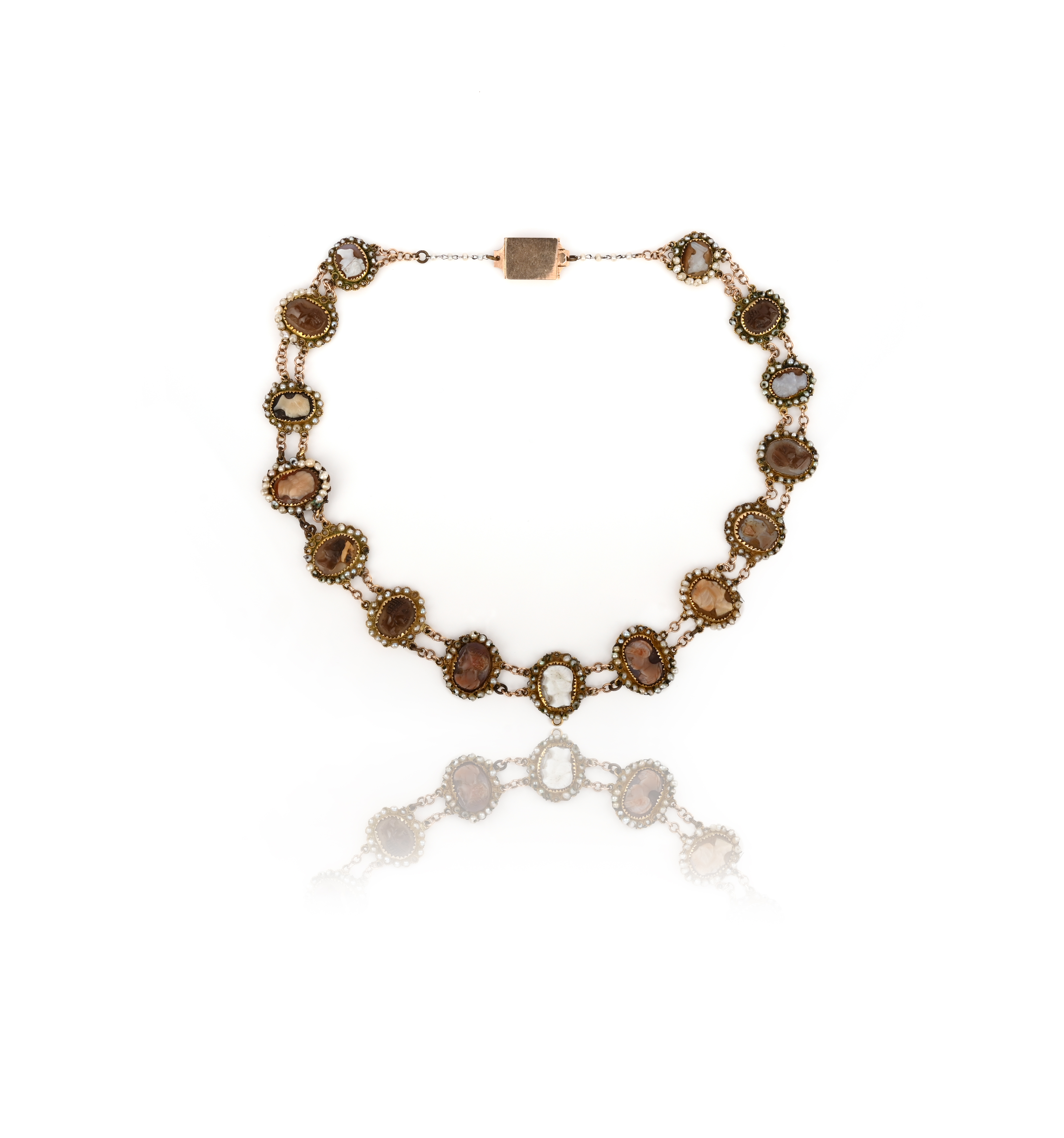 A seed pearl and hardstone cameo necklace, 19th century, composed of fifteen hardstone cameos, each mounted in gold within a border of seed pearls, later seed pearl extension and clasp, length 37.5cm, largest cameo 1.2 x 0.8cm, case stamped R&S Garrard & Co.