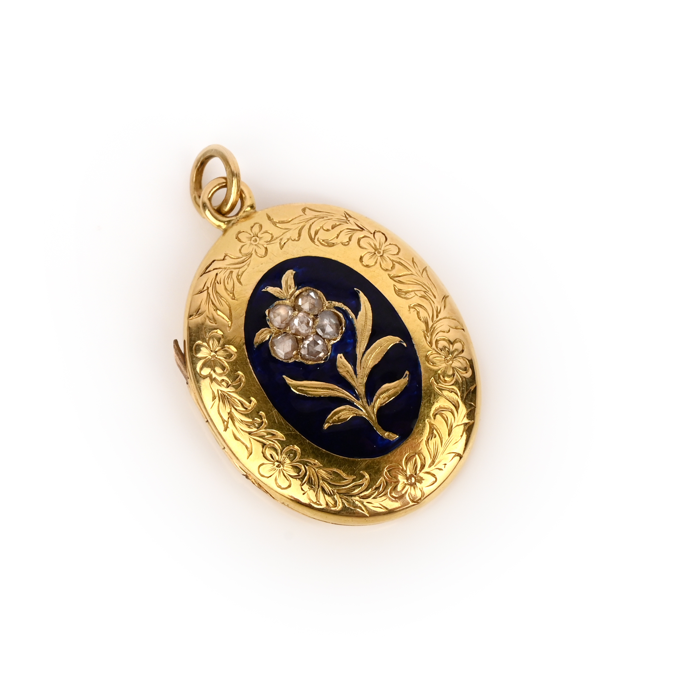 A gold, enamel and diamond locket pendant, mid 19th century, the oval gold locket with a design of a flower in reserve against blue enamel, its petals set with rose-cut diamonds, the reverse with an anchor in blue enamel, each within a border of incised floral scrolls, opening to reveal a portrait miniature and the inscription 'AW to AM, 11th August 1856', length 3.8cm including bail