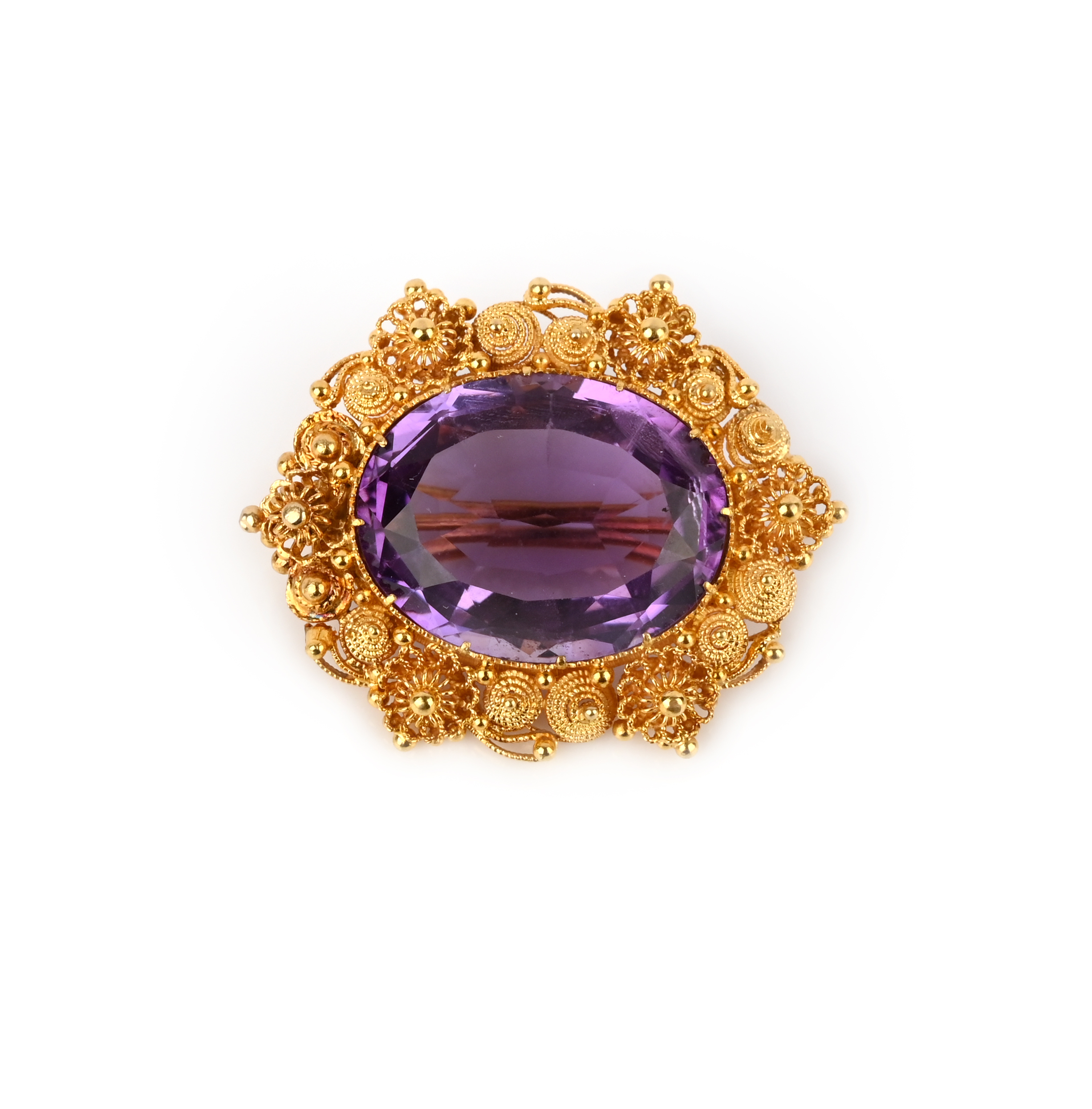 An amethyst brooch, 1830s, claw-set with an oval amethyst in a frame of gold cannetille, length 3.3cm