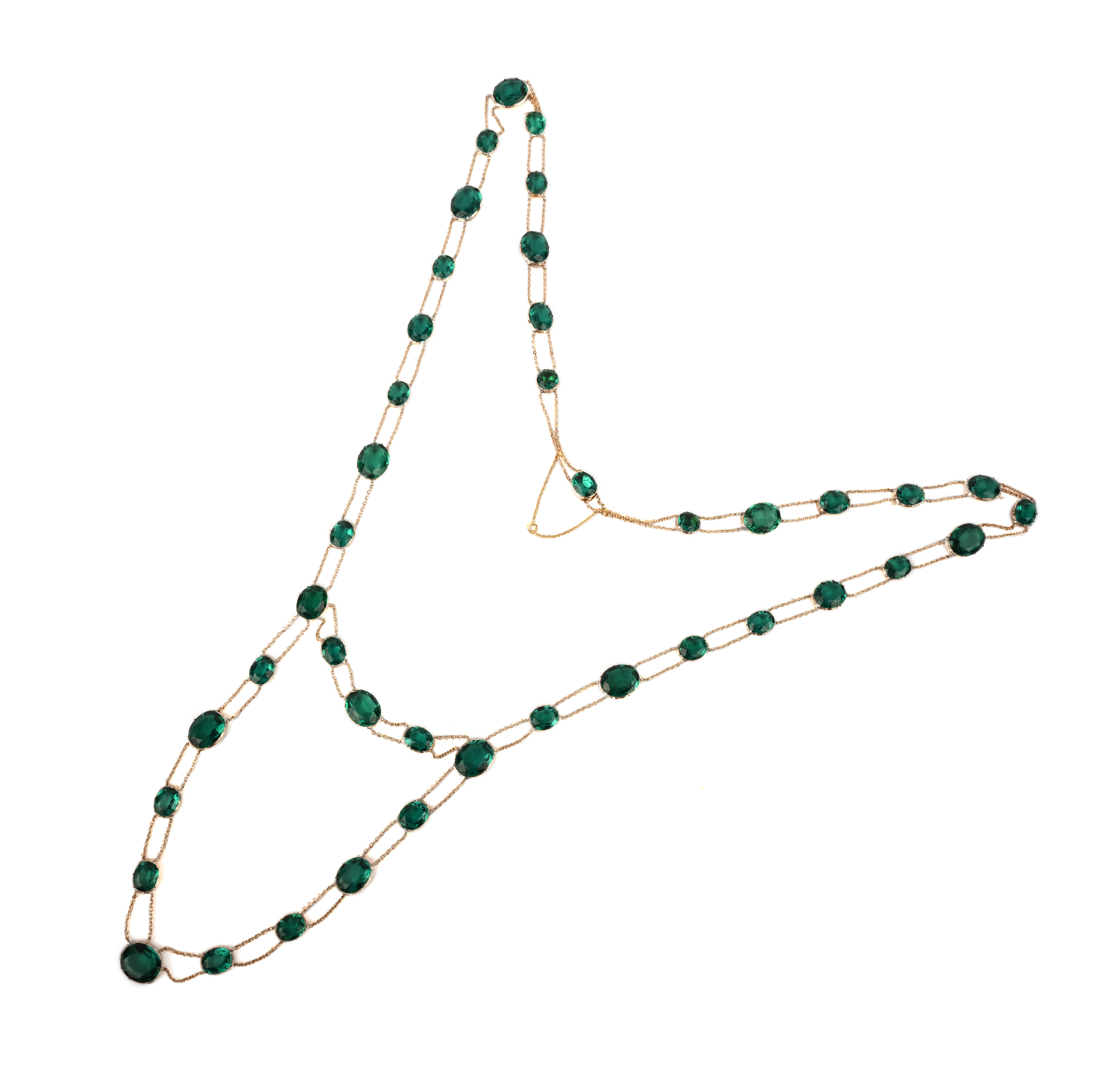 A green paste necklace, 19th century and later, designed as a long chain with a festoon to the front, composed of collet-set green pastes connected by two strands of fine gold chain, length 88cm