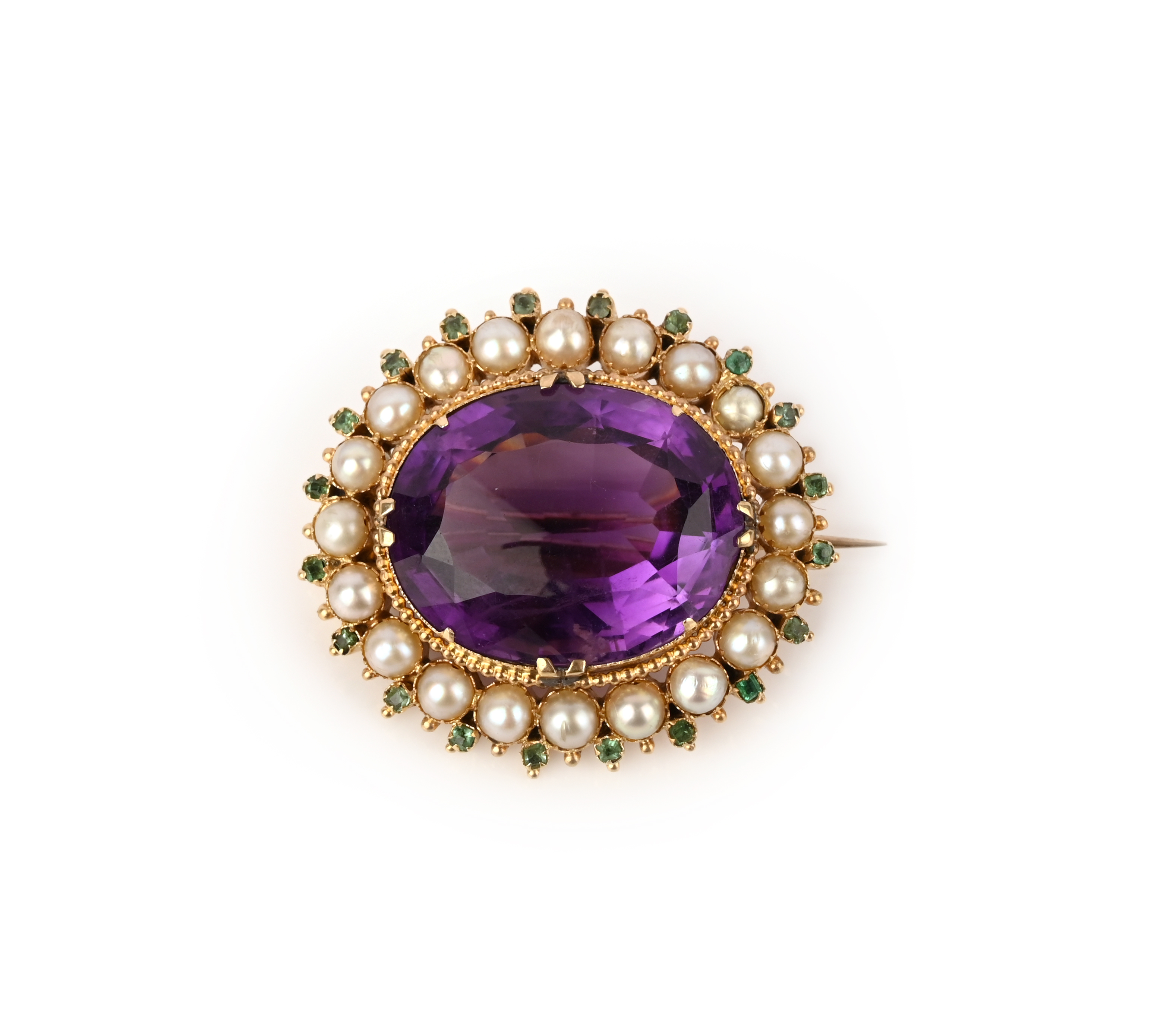 An amethyst, emerald and pearl brooch, mid 19th century, claw-set with an oval amethyst, within a border of half pearls accented with step-cut emeralds, mounted in gold, length 3.6cm,