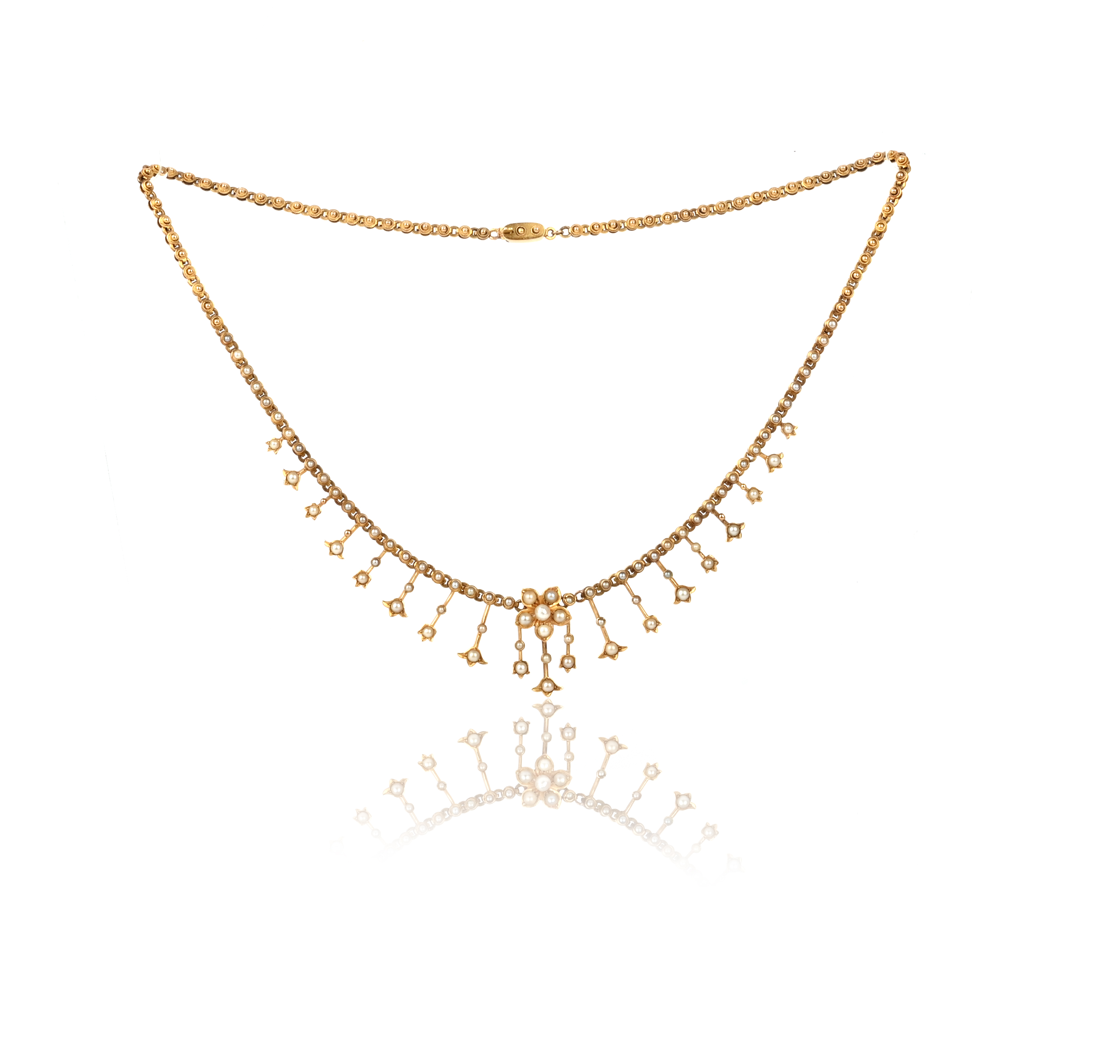 A Victorian seed pearl fringe necklace, with a flowerhead centre, on fancy-link yellow gold chain, 40cm long