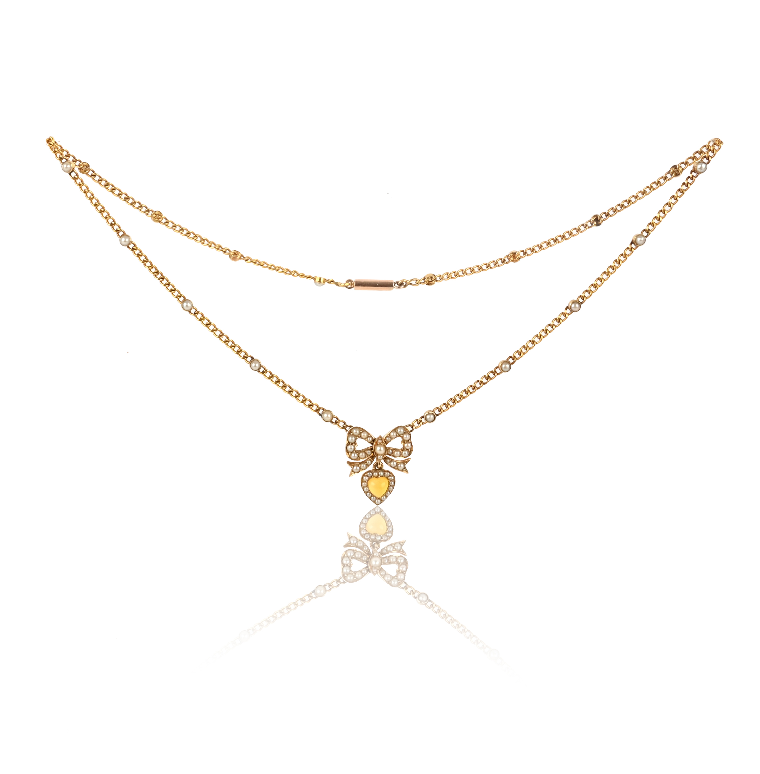 An Edwardian seed pearl-set gold necklace, the seed pearl bow suspending a citrine heart and on a curb-link necklace set with seed pearls, 38cm long