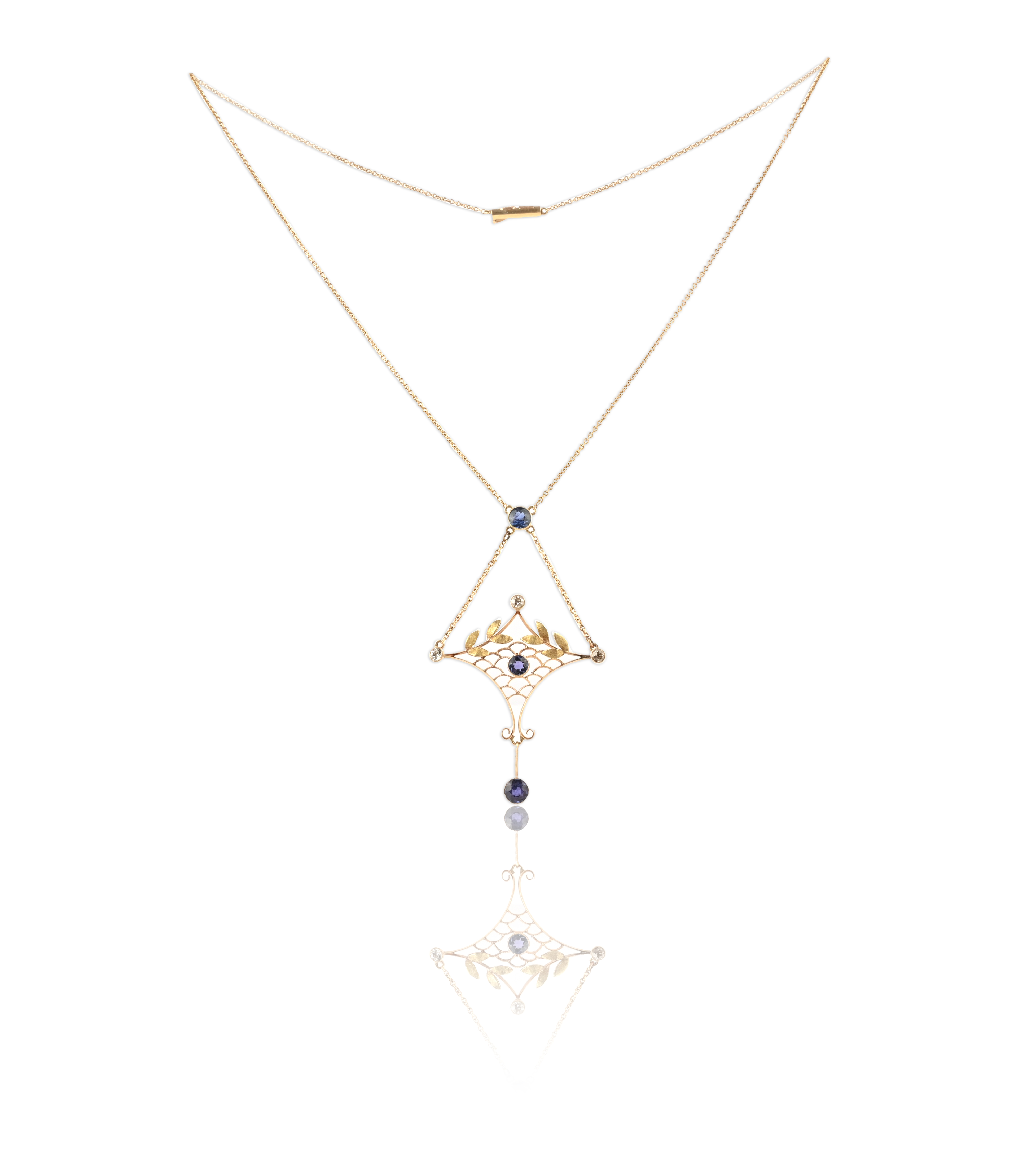 An Arts and Crafts sapphire and diamond pendant necklace, early 20th century, of knifewire construction, the top decorated with laurel leaves, millegrain-set with circular-cut sapphires and diamonds, suspended from an additional circular-cut sapphire, to a fine link chain, mounted in gold, pendant length 5.8cm, necklace length 44cm