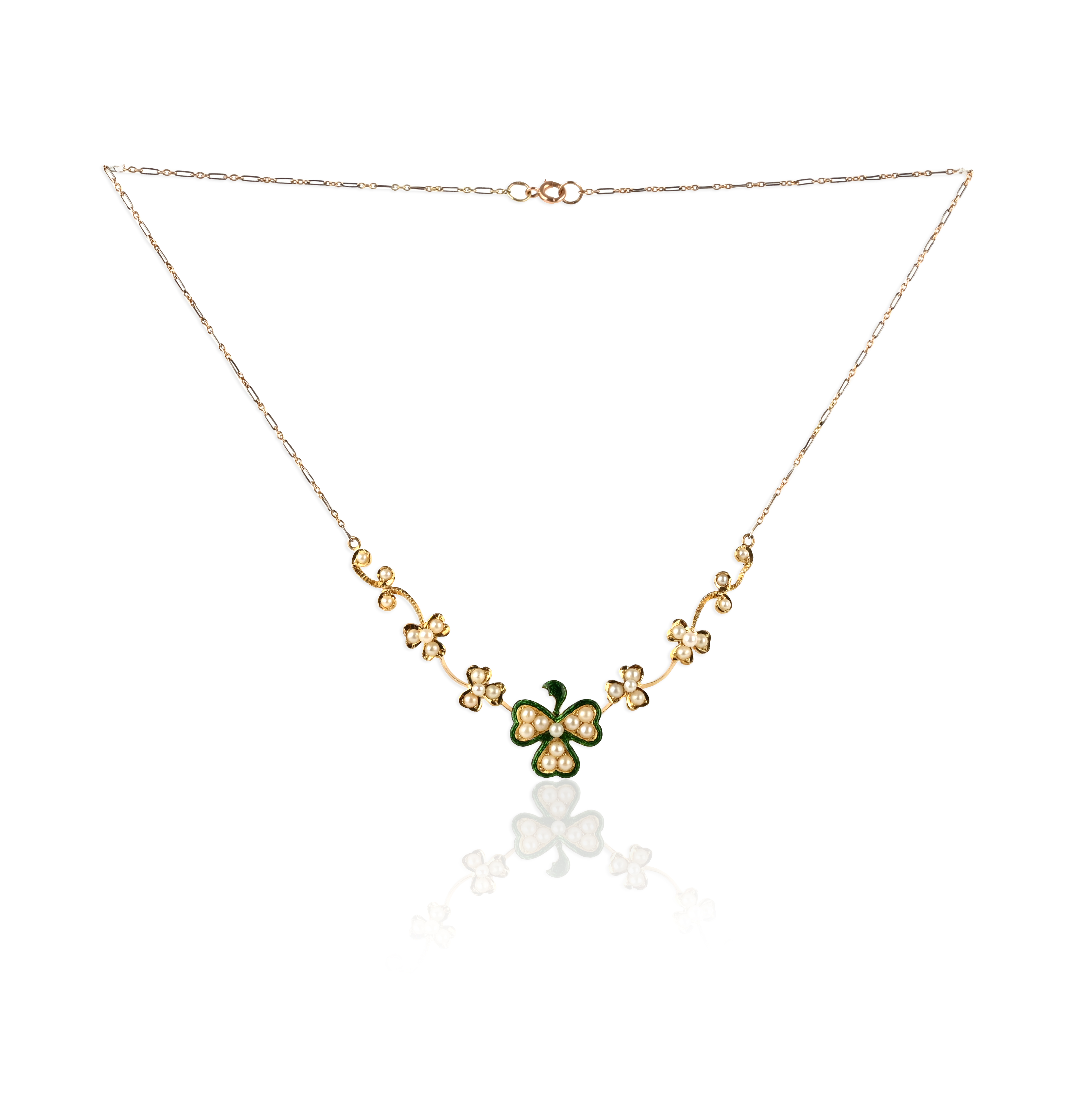 A seed pearl and enamel necklace, early 20th century, the front of knife wire construction, designed as a graduated line of shamrocks, the central shamrock applied with green basse taille enamel, to bicoloured gold backchain, length 40cm, stamped 750, pearls untested