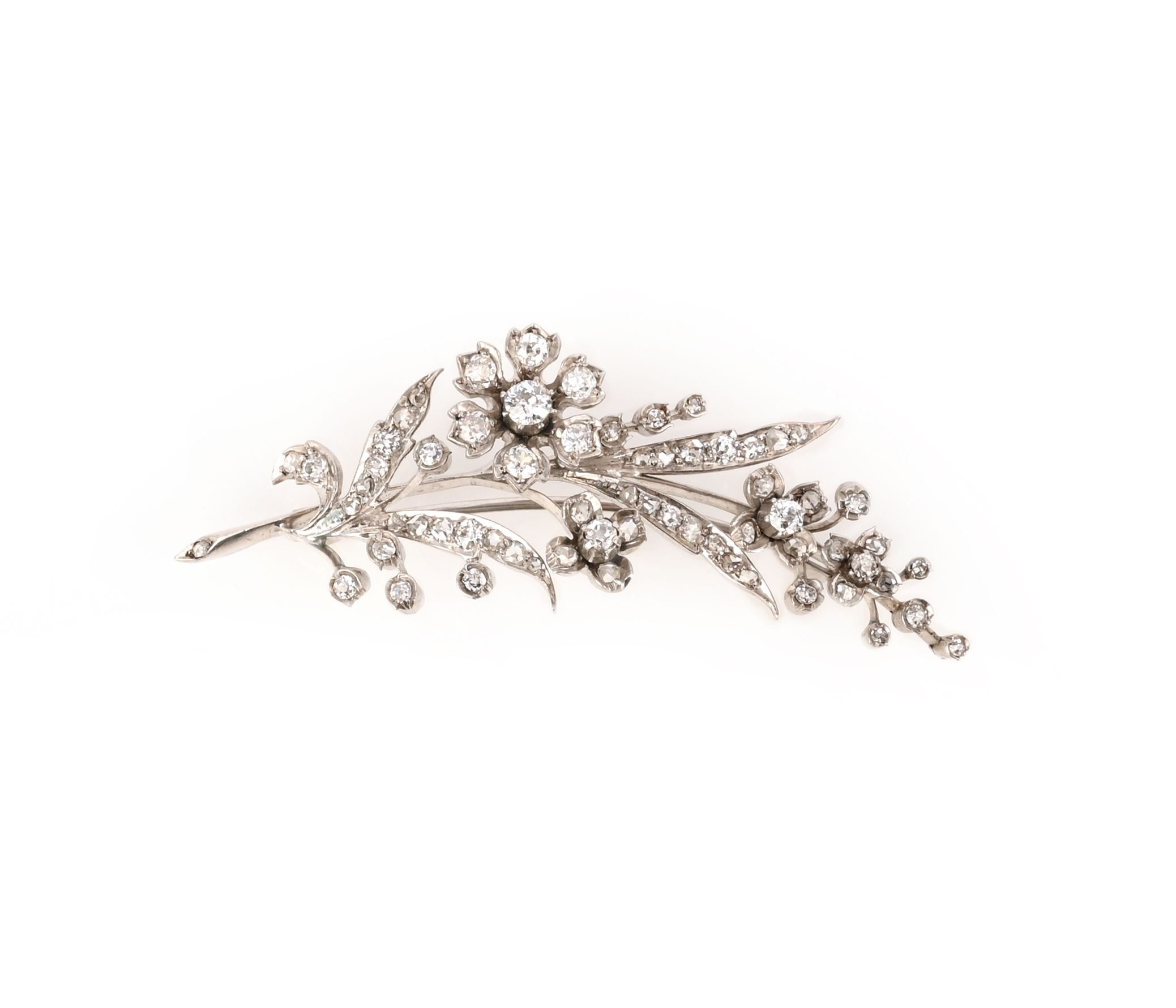 A Victorian diamond brooch, late 19th century, designed as a spray of flowers, set with circular- and rose-cut diamonds, length 7cm, later rhodium plating