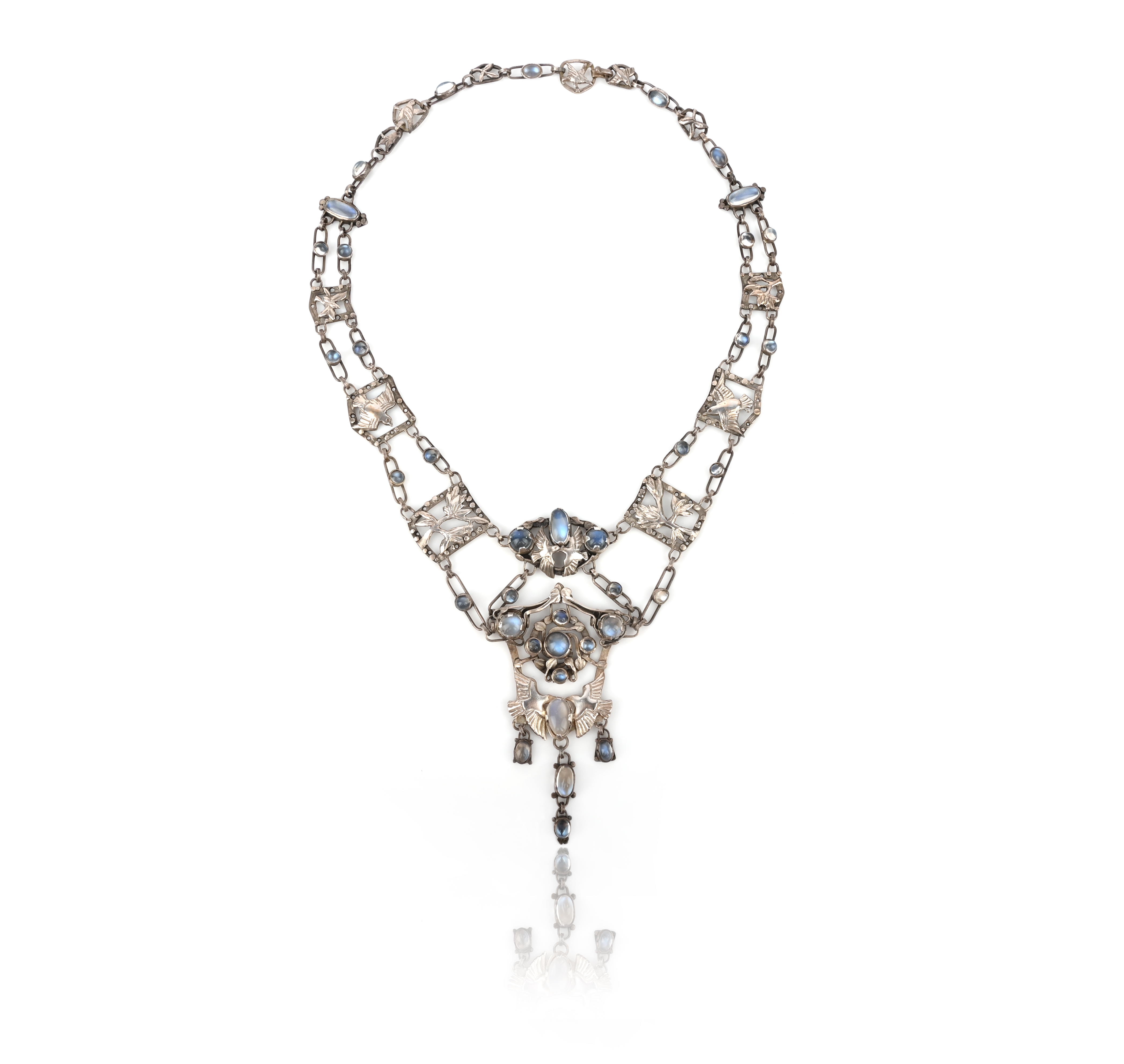 An Arts and Crafts silver and moonstone necklace, early 20th century, composed of links with designed of birds and plants, set with cabochon moonstones, length 44cm, case