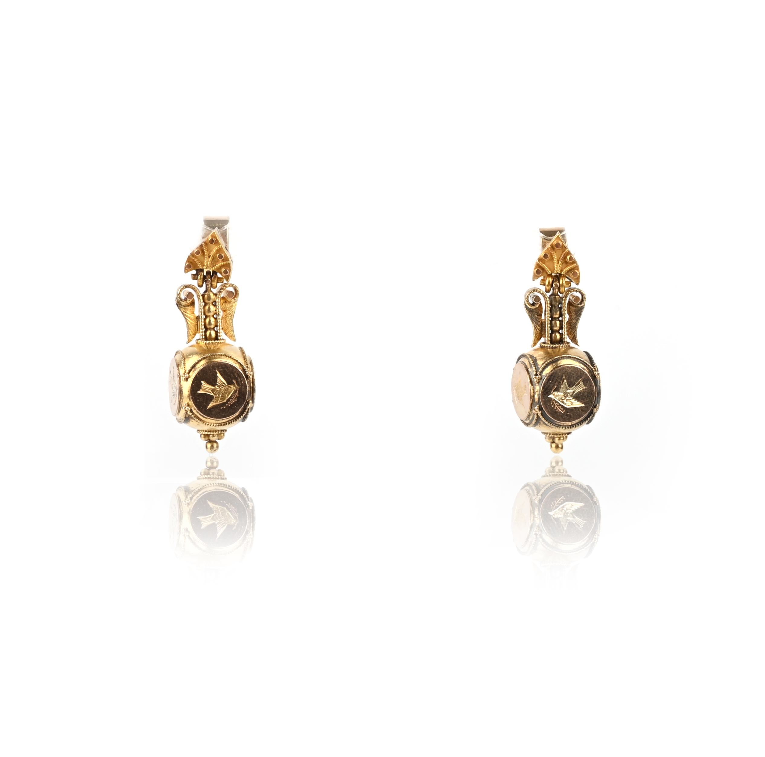 A pair of gold earrings, late 19th century, composite, composed of sectioned gold scroll surmounts suspending a cube motif, each side with a circular panel depicting a bird in flight, later post fittings, length 2.9cm
