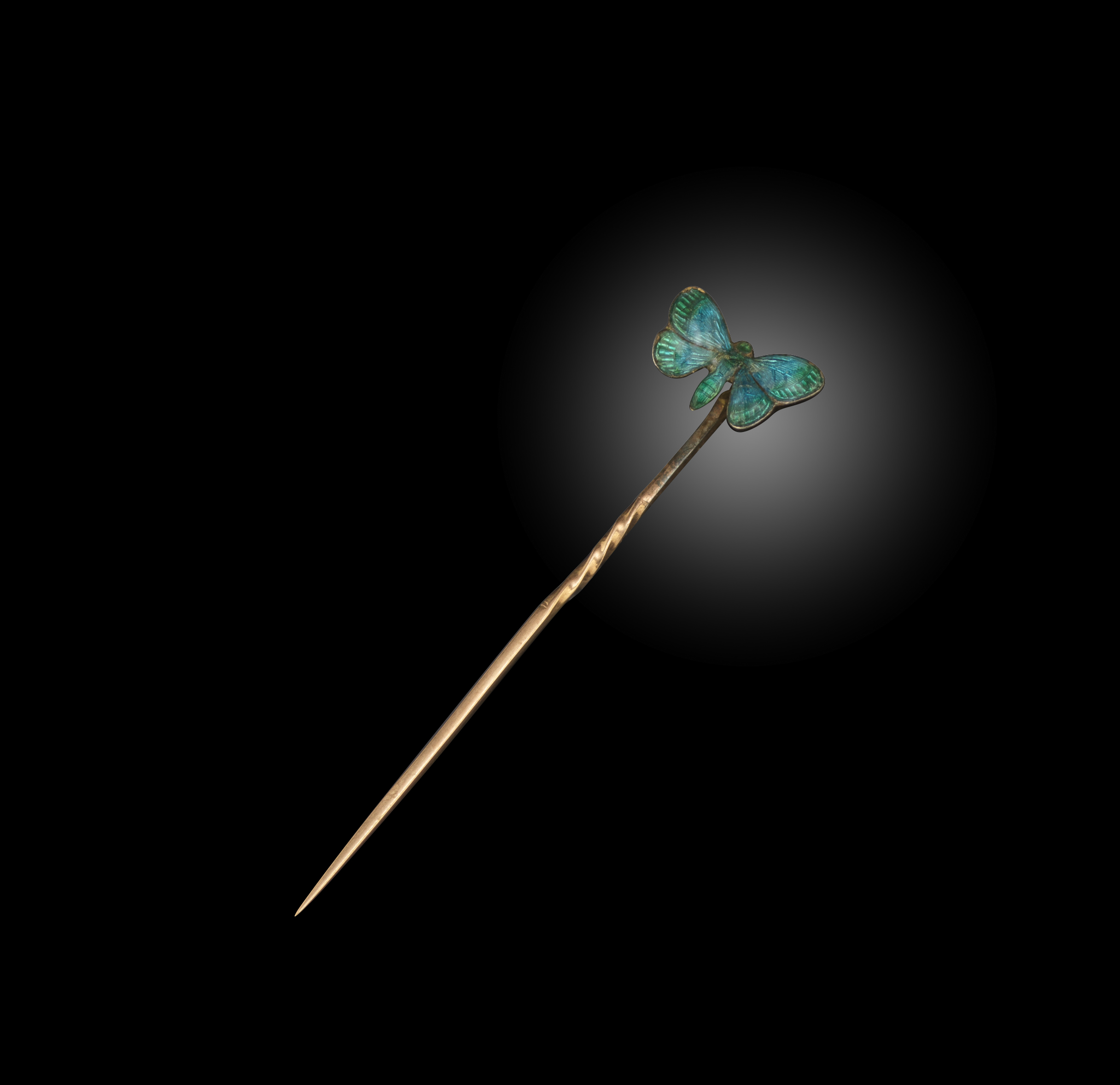 Child & Child, an enamel stick pin, circa 1900, designed as a butterfly applied with blue and green basse taille enamel, length 5.2cm, maker's mark for Child & Child