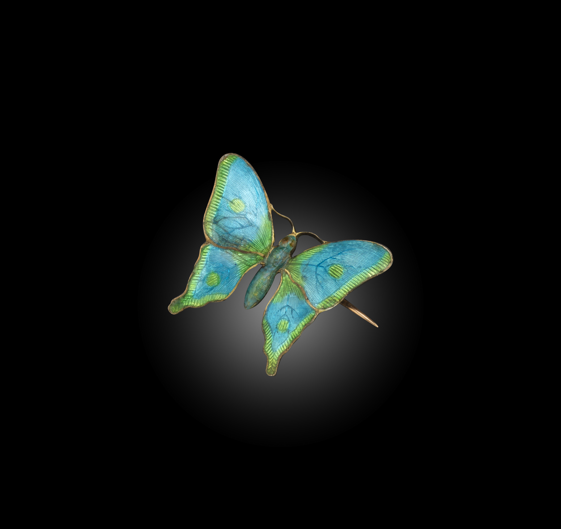 Child & Child, an enamel brooch, circa 1900, designed as a butterfly, applied with green and blue basse taille enamel, wingspan 2.9cm, maker's mark for Child & Child, case