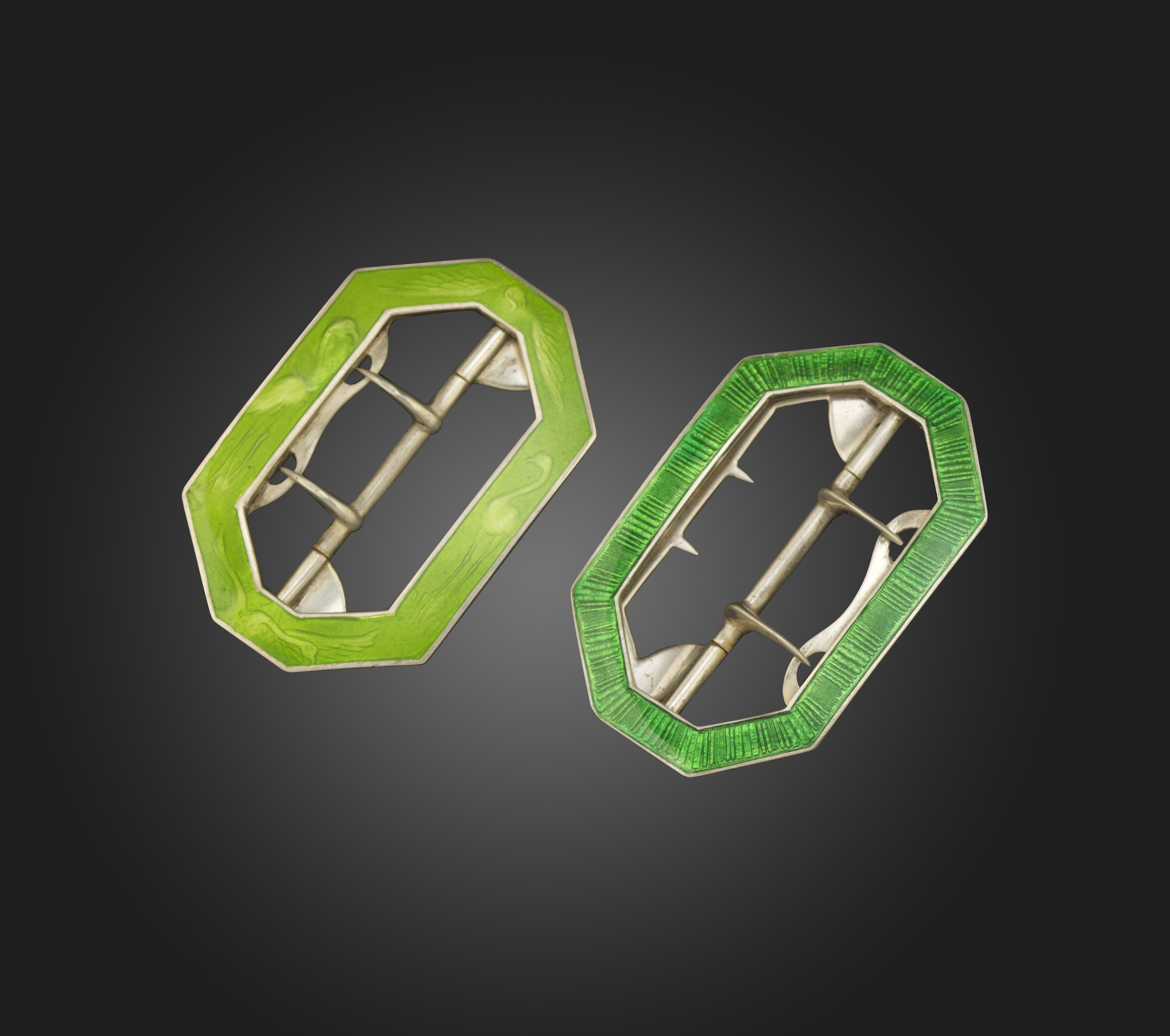 Child & Child, two silver and enamel buckles, circa 1900, each of elongated octagonal outline, applied with green basse taille enamel, one engraved with a radiating design, the other with a design of cranes, length 4.7cm each, each signed Child & Child, fitted case stamped Child & Child