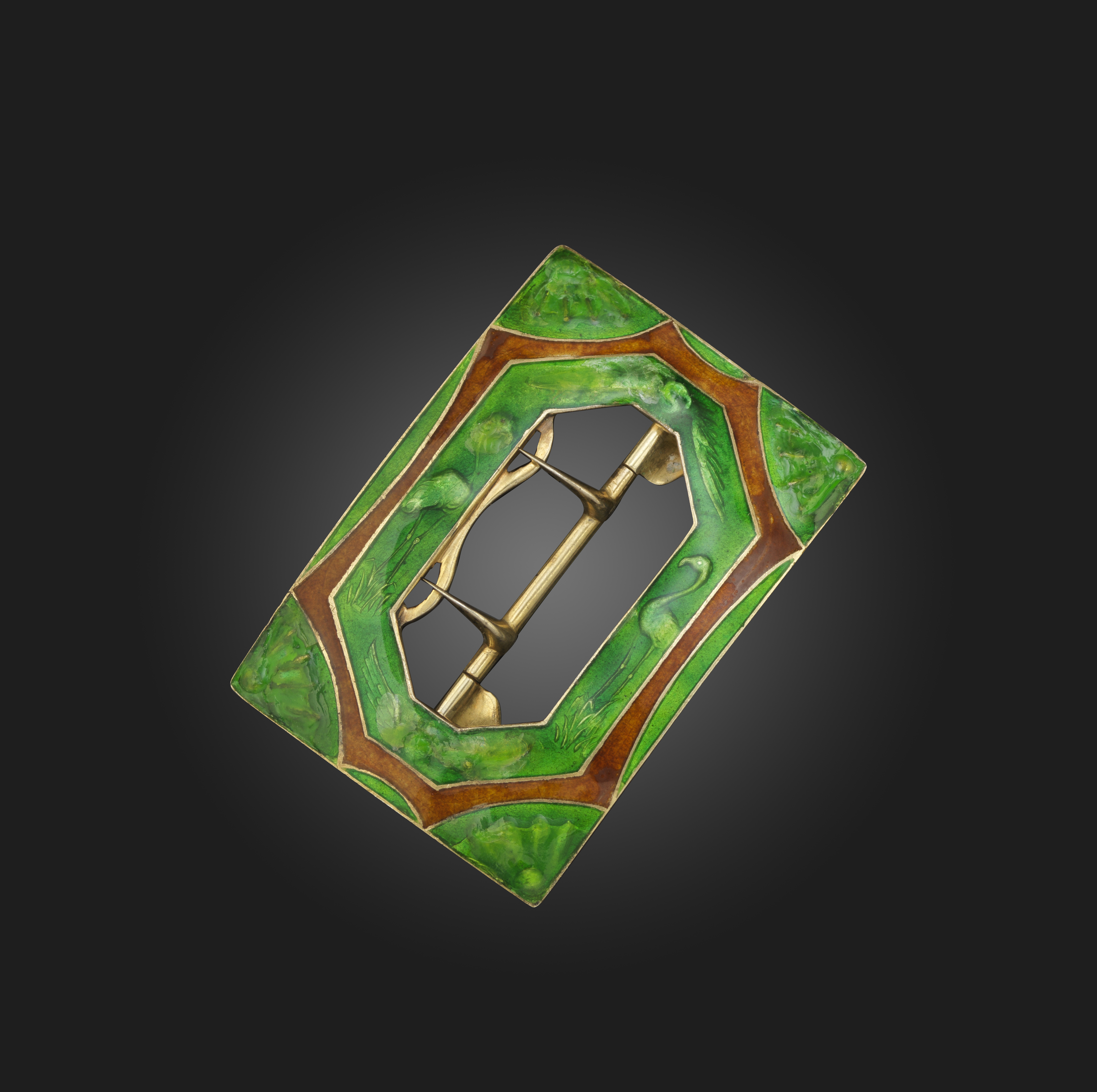 Child & Child, a silver and enamel buckle, circa 1900, of rectangular outline, applied with green and yellow ochre basse taille enamel over a design of flamingos, the corners with fan motifs, measuring 5.4 x 3.8, mounted with a bow