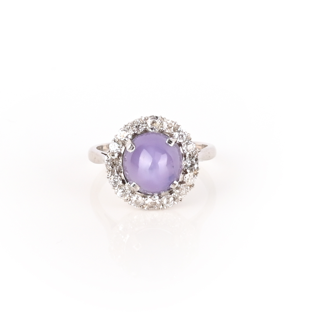 A star sapphire and diamond ring, claw-set with a cabochon violet star sapphire, within a border of circular-cut diamonds, mounted in platinum, size O, stamped PLATINUM
