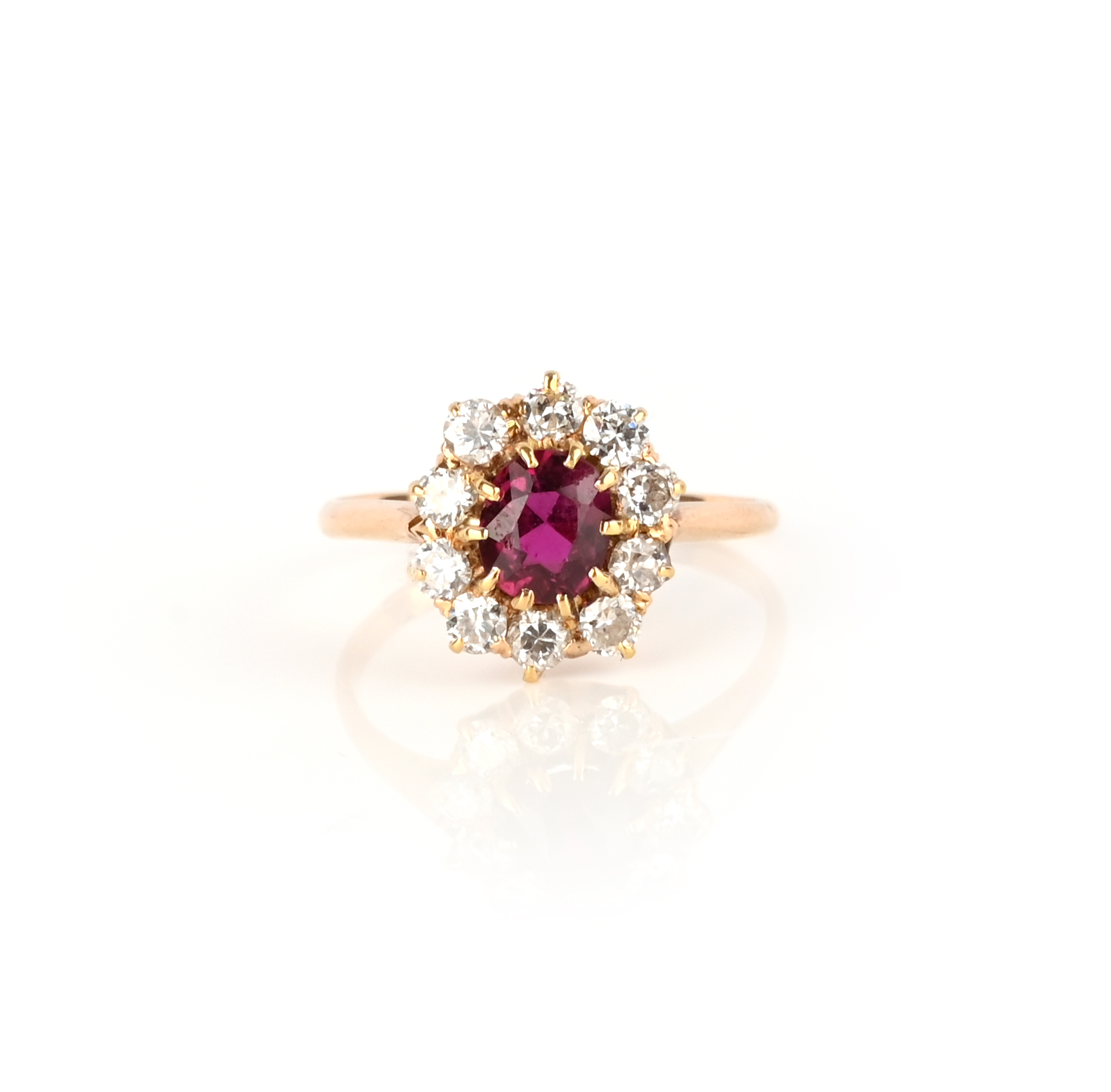 A ruby and diamond cluster ring, the cushion-shaped ruby set within a surround of old-cut diamonds in yellow gold, size Q