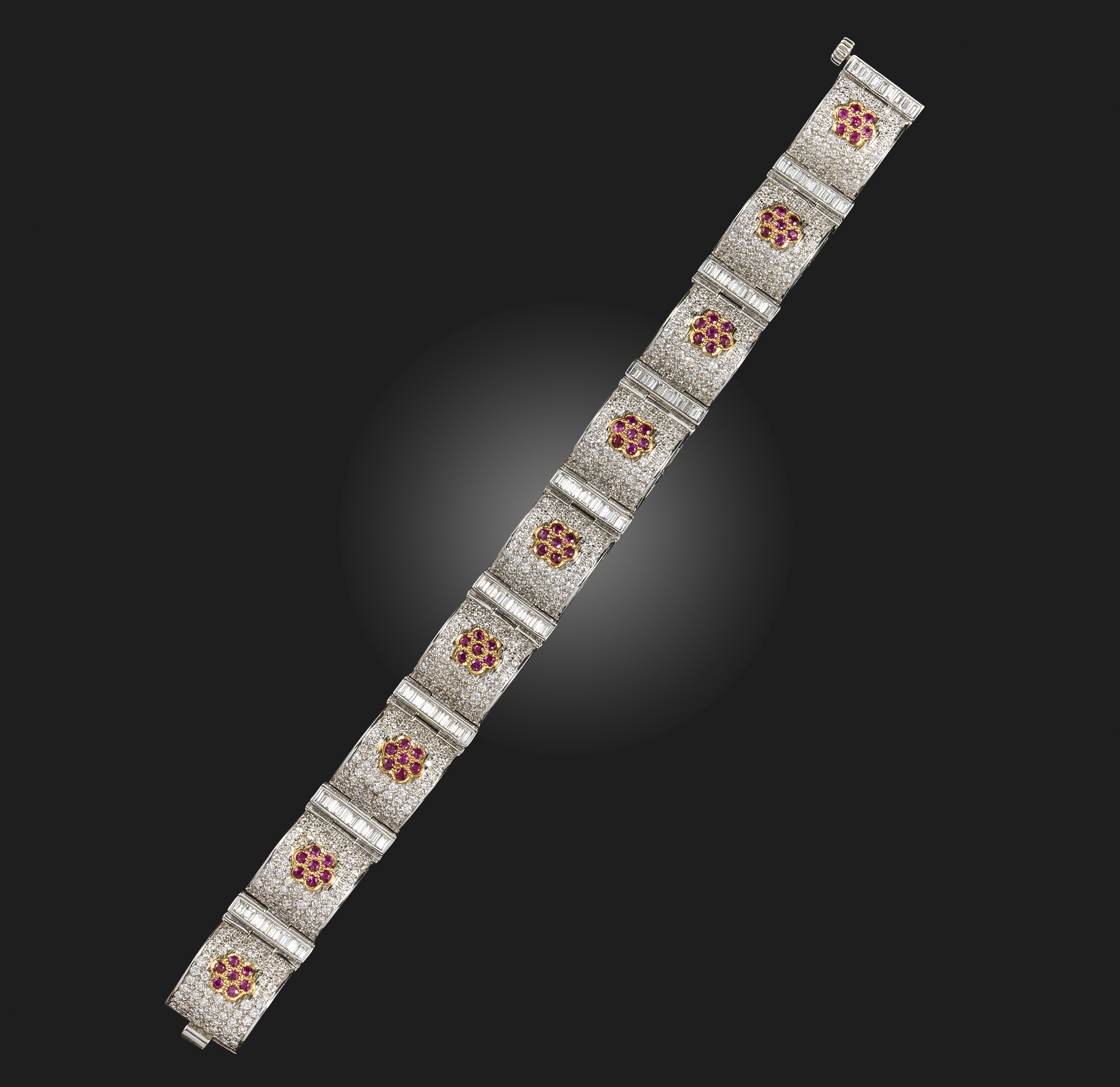 A ruby and diamond bracelet, the domed panels pave-set with diamonds and a cluster of rubies, each separated with a row of baguette-shaped diamonds in white gold, 19cm long