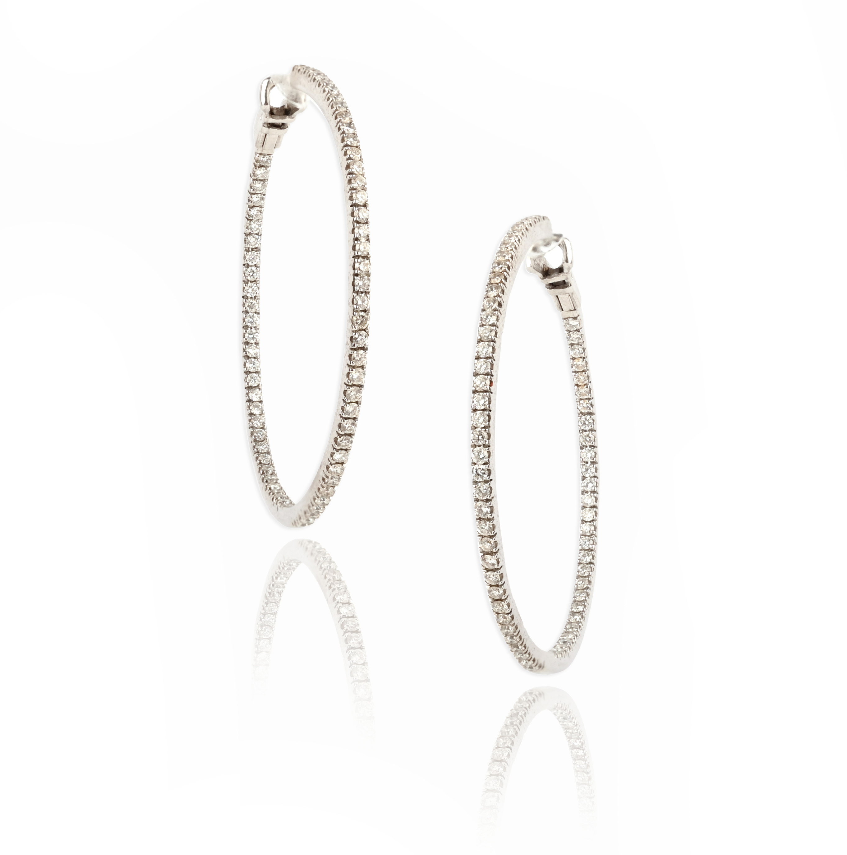 A pair of diamond-set gold hoop earrings, set with a line of round brilliant-cut diamonds to the exterior and interior of the hoop in white gold, post fittings, 5cm high